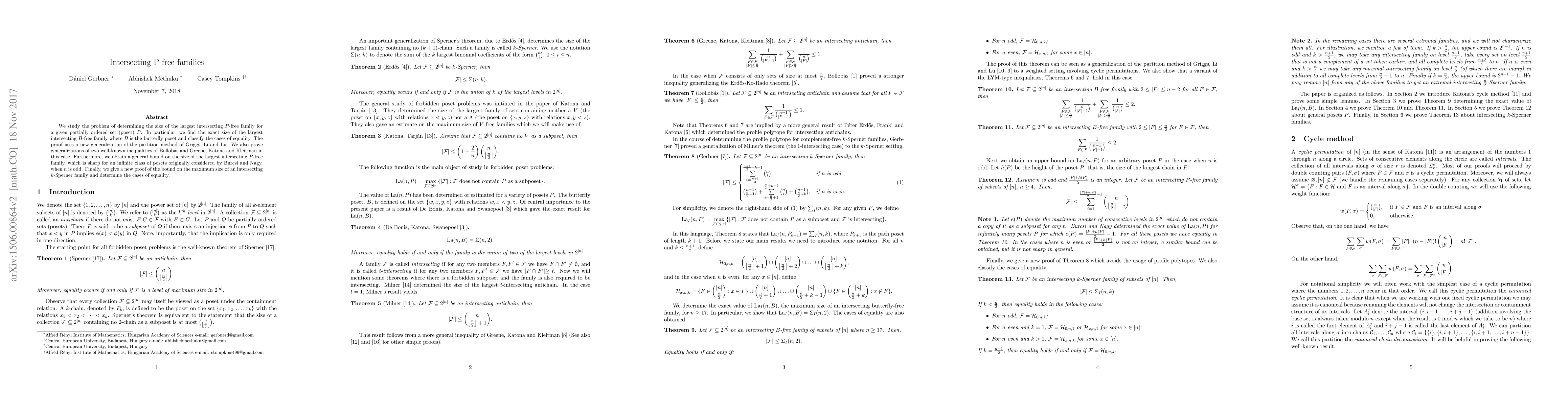 We study the problem of determining the size of the largest intersecting $P$-free family for a given partially ordered set (poset) $P$. In particular, we find the exact size of the largest intersecting $B$-free family where $B$ is the butterfly poset and classify the cases of equality. The proof uses a new generalization of the partition method of Griggs, Li and Lu. We also prove generalizations of two well-known inequalities of Bollob\'{a}s and Greene, Katona and Kleitman in this case. Furthermore, we obtain a general bound on the size of the largest intersecting $P$-free family, which is sharp for an infinite class of posets originally considered by Burcsi and Nagy, when $n$ is odd. Finally, we give a new proof of the bound on the maximum size of an intersecting $k$-Sperner family and determine the cases of equality.