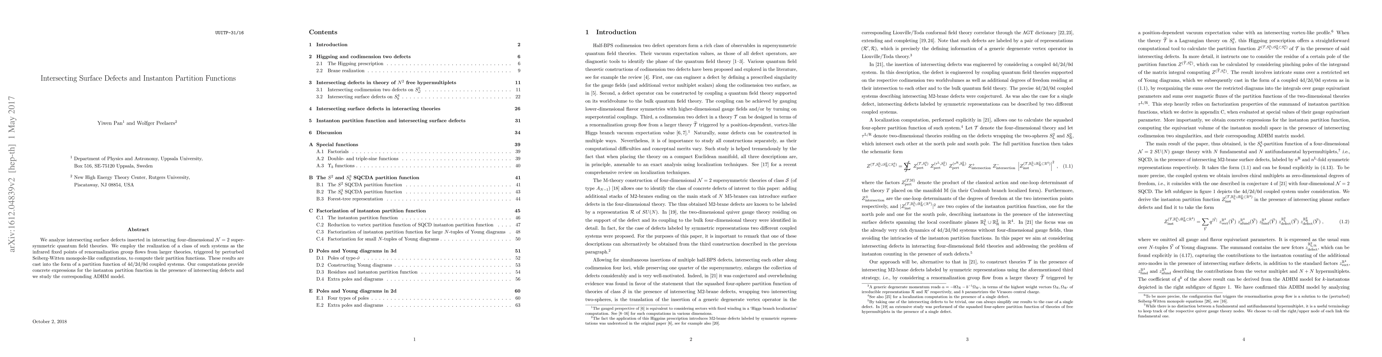 This paper computes instanton partition functions for intersecting surface defects in four-dimensional N = 2 supersymmetric quantum field theories, using renormalization group flows and ADHM model frameworks to derive concrete expressions. The study reveals the structure of coupled 4d/2d/0d systems with such defects.