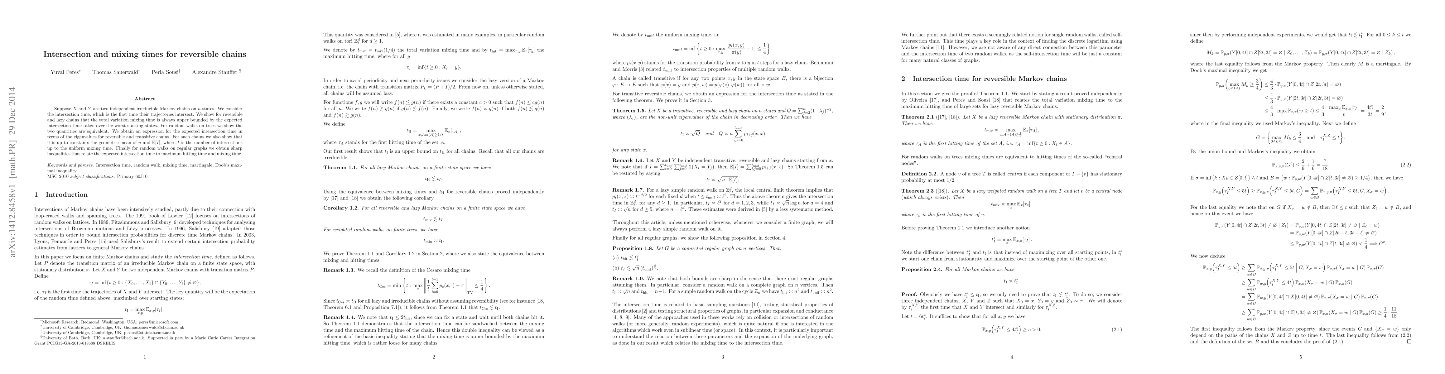 This paper explores the intersection and mixing times of two independent reversible Markov chains, demonstrating that their total variation mixing time is upper bounded by the expected intersection time. It provides specific results for random walks on trees and regular graphs, showing equivalence between intersection and mixing times, and deriving expressions for expected intersection times in terms of eigenvalues.