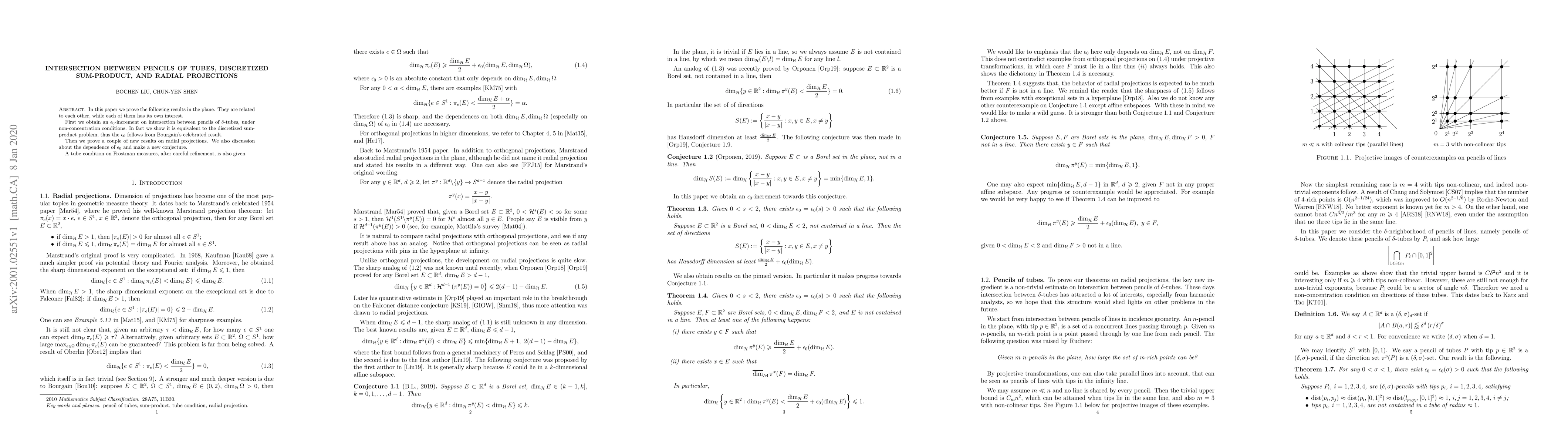Researchers prove an intersection between pencils of tubes, sum-product problem, and radial projections in a plane, leading to new results and a conjecture on Frostman measures.