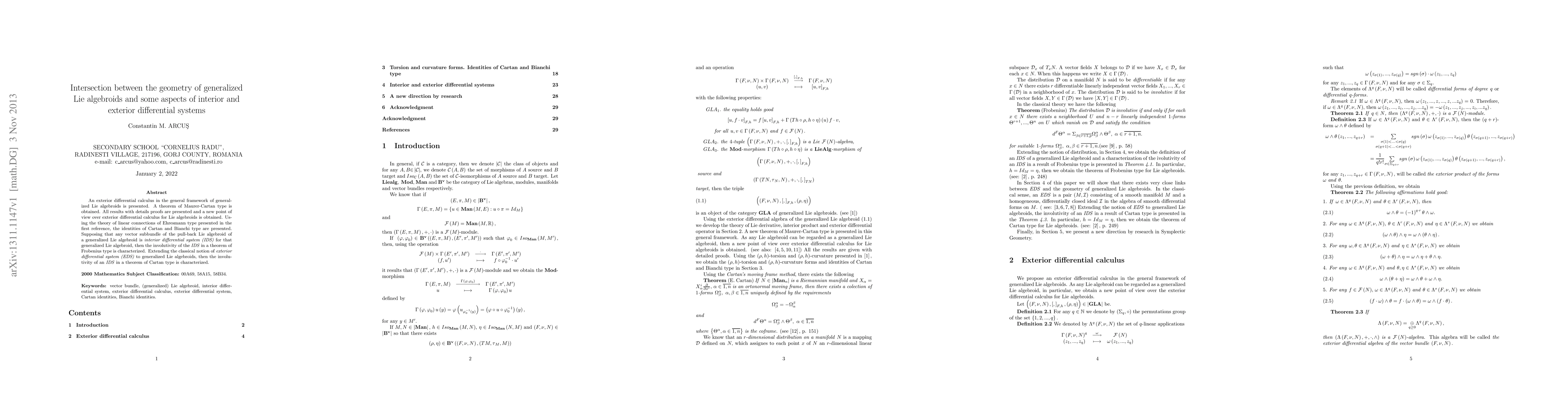 An exterior differential calculus in the general framework of generalized Lie algebroids is presented. A theorem of Maurer-Cartan type is obtained. All results with details proofs are presented and a new point of view over exterior differential calculus for Lie algebroids is obtained. Using the theory of linear connections of Ehresmann type presented in the firstt reference, the identities of Cartan and Bianchi type are presented. Supposing that any vector subbundle of the pull-back Lie algebroid of a generalized Lie algebroid is interior differential system (IDS) for that generalized Lie algebroid, then the involutivity of the IDS in a theorem of Frobenius type is characterized. Extending the classical notion of exterior differential system (EDS) to generalized Lie algebroids, then the involutivity of an IDS in a theorem of Cartan type is characterized.