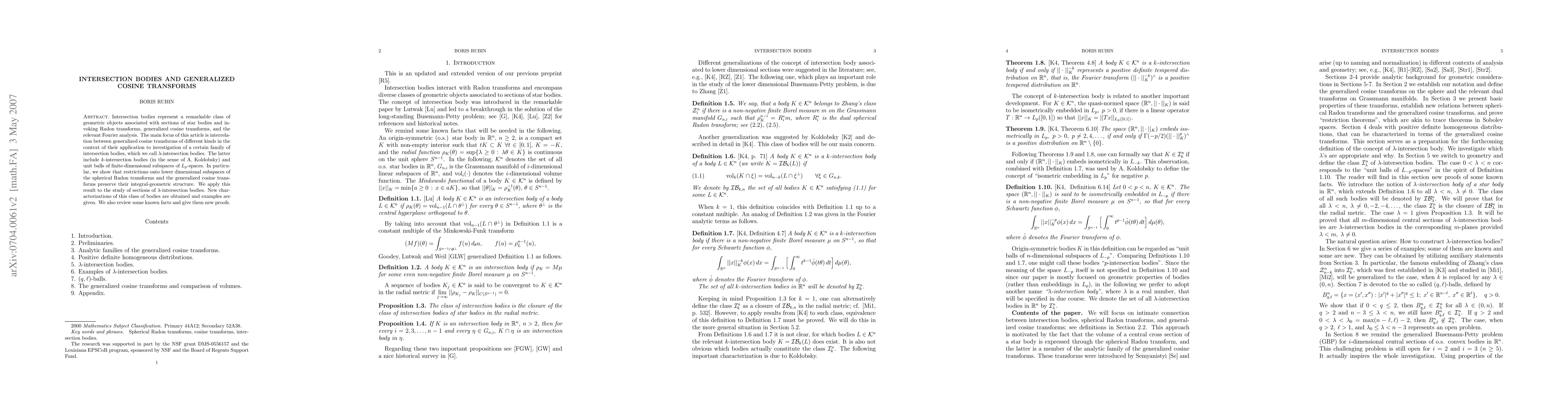 Intersection bodies represent a remarkable class of geometric objects associated with sections of star bodies and invoking Radon transforms, generalized cosine transforms, and the relevant Fourier analysis. The main focus of this article is interrelation between generalized cosine transforms of different kinds in the context of their application to investigation of a certain family of intersection bodies, which we call $\lam$-intersection bodies. The latter include $k$-intersection bodies (in the sense of A. Koldobsky) and unit balls of finite-dimensional subspaces of $L_p$-spaces. In particular, we show that restrictions onto lower dimensional subspaces of the spherical Radon transforms and the generalized cosine transforms preserve their integral-geometric structure. We apply this result to the study of sections of $\lam$-intersection bodies. New characterizations of this class of bodies are obtained and examples are given. We also review some known facts and give them new proofs.