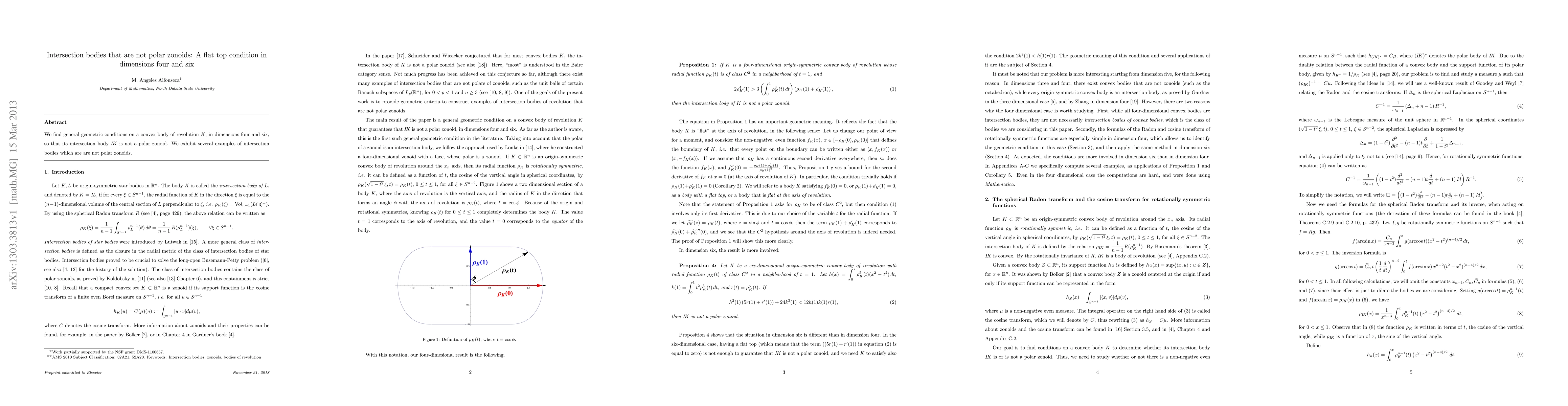 The paper analyzes general geometric conditions for a convex body of revolution K in dimensions four and six, determining when its intersection body IK is not a polar zonoid, using a flat top condition.