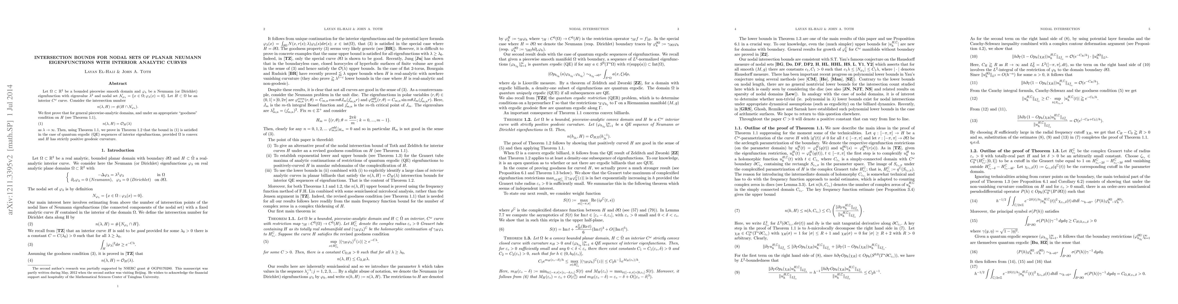 Let $ \Omega \subset R^2$ be a bounded piecewise smooth domain and $\phi_\lambda$ be a Neumann (or Dirichlet) eigenfunction with eigenvalue $\lambda^2$ and nodal set ${ N}_{\phi_{\lambda}} = {x \in \Omega; \phi_{\lambda}(x) = 0}.$ Let $H \subset \Omega$ be an interior $C^{\omega}$ curve. Consider the intersection number $$ n(\lambda,H):= \# (H \cap N_{\phi_{\lambda}} ).$$ We first prove that for general piecewise-analytic domains, and under an appropriate "goodness" condition on $H$, $$ n(\lambda,H) = {\mathcal O}_H(\lambda) (*)$$ as $\lambda \rightarrow \infty.$ We then prove that the bound in $(*)$ is satisfied in the case of quantum ergodic (QE) sequences of interior eigenfunctions, provided $\Omega$ is convex and $H$ has strictly positive geodesic curvature.