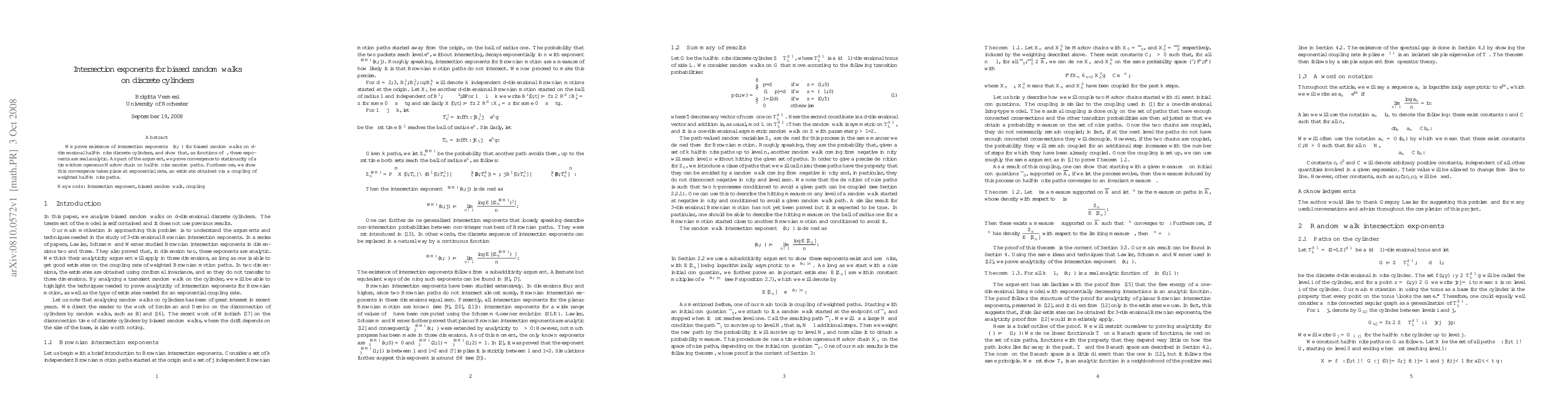 This paper establishes the existence of intersection exponents for biased random walks on d-dimensional half-infinite discrete cylinders and demonstrates their real analyticity as functions of a parameter. It also proves the convergence to stationarity of a time-inhomogeneous Markov chain on these paths, with exponential rate, using a coupling method for weighted half-infinite paths.