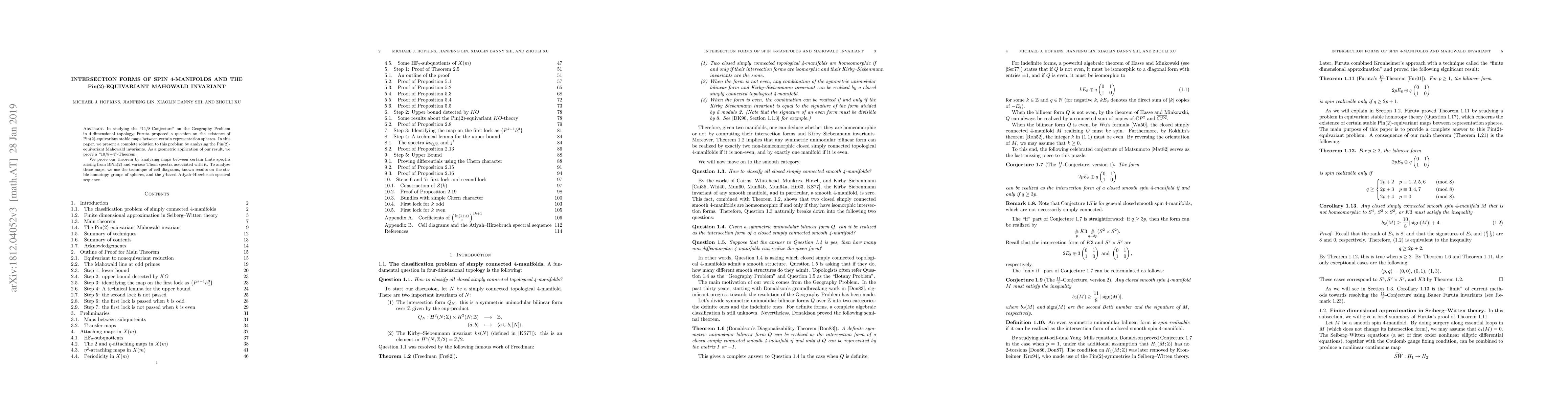 In studying the "11/8-Conjecture" on the Geography Problem in 4-dimensional topology, Furuta proposed a question on the existence of Pin(2)-equivariant stable maps between certain representation spheres. In this paper, we present a complete solution to this problem by analyzing the Pin(2)-equivariant Mahowald invariants. As a geometric application of our result, we prove a "10/8+4"-Theorem. We prove our theorem by analyzing maps between certain finite spectra arising from BPin(2) and various Thom spectra associated with it. To analyze these maps, we use the technique of cell diagrams, known results on the stable homotopy groups of spheres, and the $j$-based Atiyah-Hirzebruch spectral sequence.