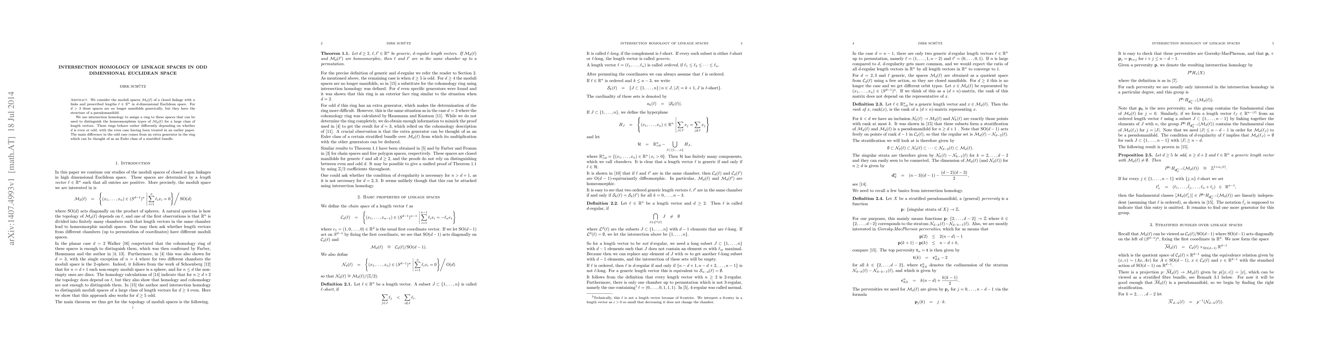 This paper investigates the moduli spaces of linkages in odd-dimensional Euclidean space using intersection homology to distinguish their homeomorphism types. It finds that the spaces, which are pseudomanifolds, have a ring structure with an extra generator in the odd-dimensional case, akin to an Euler class of a stratified bundle.