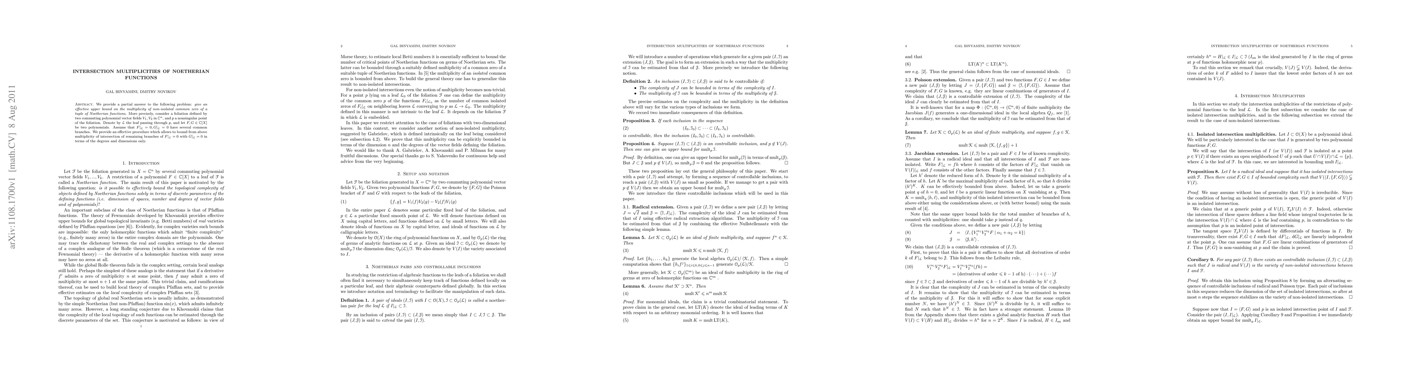 We provide a partial answer to the following problem: \emph{give an effective upper bound on the multiplicity of non-isolated common zero of a tuple of Noetherian functions}. More precisely, consider a foliation defined by two commuting polynomial vector fields $V_1,V_2$ in $\C^n$, and $p$ a nonsingular point of the foliation. Denote by $\cL$ the leaf passing through $p$, and let $F,G\in\C[X]$ be two polynomials. Assume that $F\onL=0,G\onL=0$ have several common branches. We provide an effective procedure which allows to bound from above multipllicity of intersection of remaining branches of $F\onL=0$ with $G\onL=0$ in terms of the degrees and dimensions only.