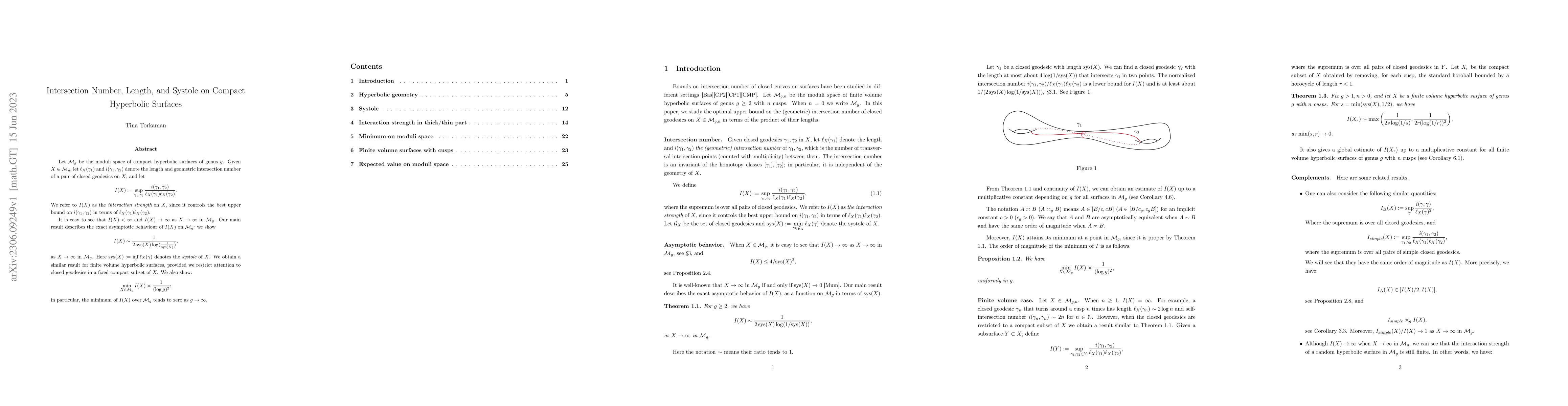 This paper investigates the asymptotic behavior of the interaction strength $I(X)$ on compact hyperbolic surfaces, defined as the supremum of the ratio of intersection numbers to the product of lengths of closed geodesics. The main result shows that $I(X)$ asymptotically behaves as $1/(2\operatorname{sys}(X)\log(1/\operatorname{sys}(X)))$ as the surface tends to infinity in the moduli space, where $\operatorname{sys}(X)$ is the systole. Additionally, it finds that the minimum of $I(X)$ over the moduli space tends to zero as the genus increases.