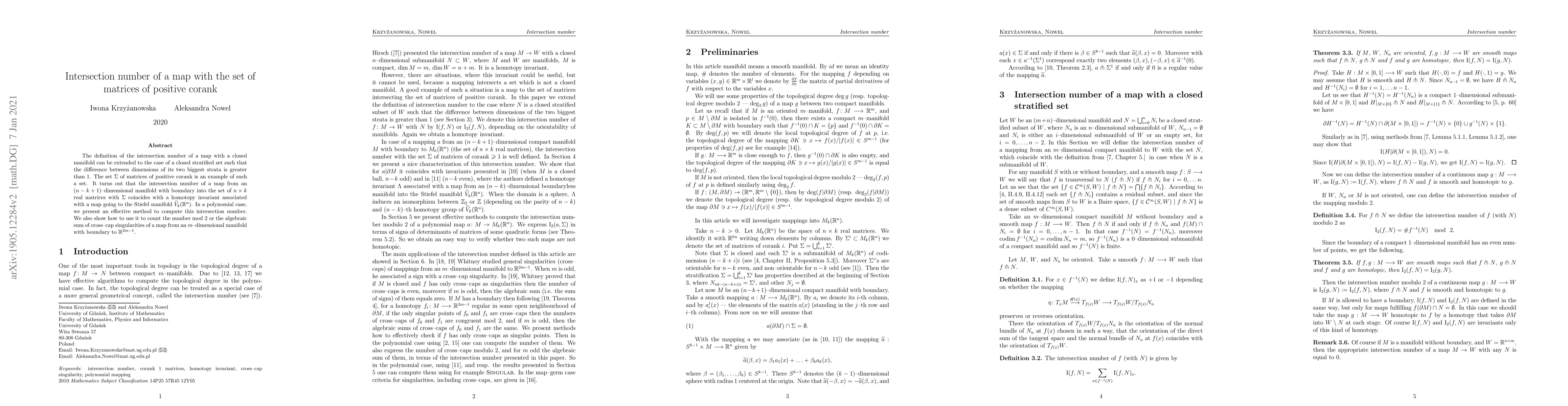 The definition of the intersection number of a map with a closed manifold can be extended to the case of a closed stratified set such that the difference between dimensions of its two biggest strata is greater than $1$. The set Sigma of matrices of positive corank is an example of such a set. It turns out that the intersection number of a map from an (n-k+1)--dimensional manifold with boundary into the set of (n x k) real matrices with Sigma coincides with a homotopy invariant associated with a map going to the Stiefel manifold. In a polynomial case, we present an effective method to compute this intersection number. We also show how to use it to count the number mod 2 or the algebraic sum of cross--cap singularities of a map from an m--dimensional manifold with boundary to R^{2m-1}.