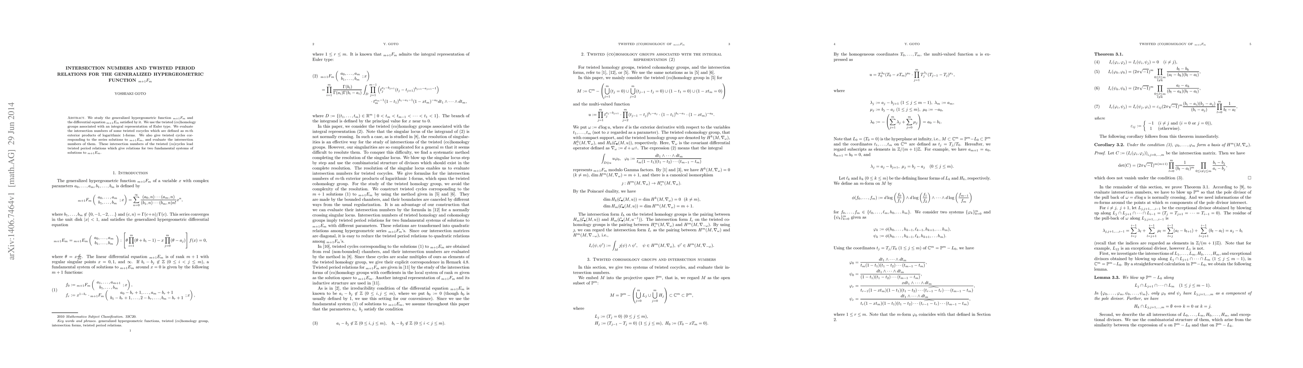 This paper investigates the generalized hypergeometric function ${}_{m+1} F_m$ and its associated differential equation ${}_{m+1}E_m$, using twisted (co)homology groups. It evaluates intersection numbers of twisted cocycles and cycles, leading to twisted period relations for two fundamental systems of solutions to ${}_{m+1}E_m$.