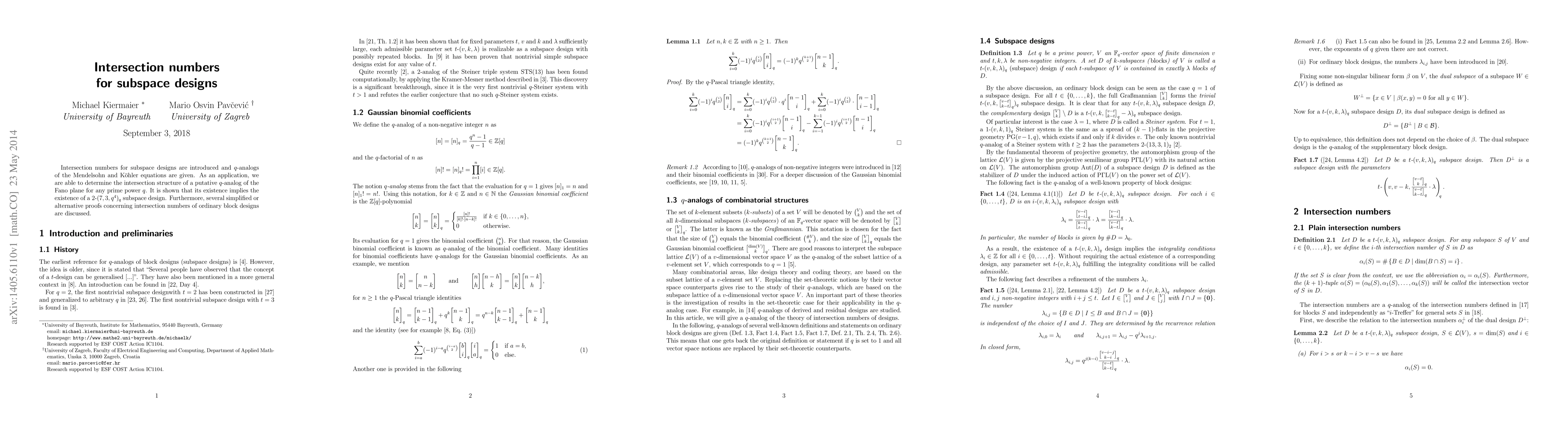 This paper introduces intersection numbers for subspace designs and provides $q$-analogs of Mendelsohn and Köhler equations. It determines the intersection structure for a $q$-analog of the Fano plane, showing its existence implies a $2$-$(7,3,q^4)_q$ subspace design, and offers simplified proofs for intersection numbers in ordinary block designs.