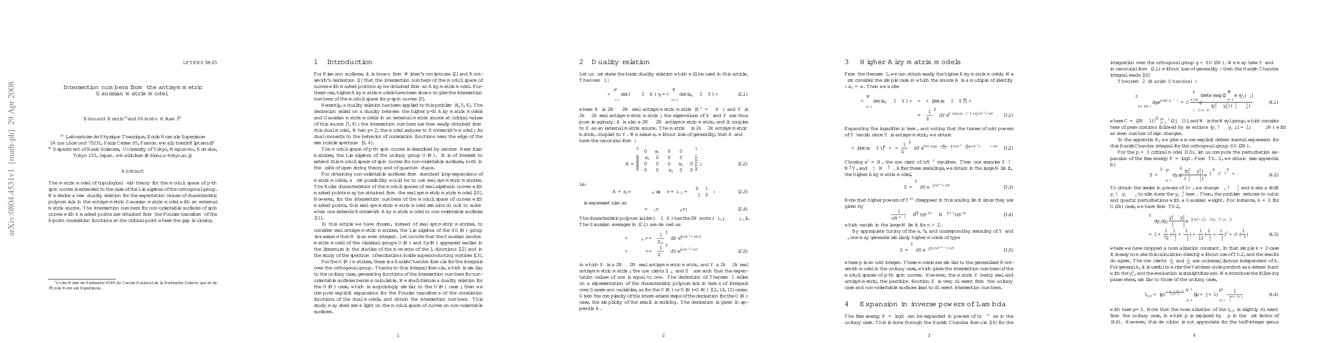 This paper extends the matrix model of topological field theory to the orthogonal group, deriving a new duality relation for characteristic polynomials in the antisymmetric Gaussian matrix model. It computes intersection numbers for non-orientable spin curves using Fourier transforms of k-point correlation functions at a critical gap-closing point.