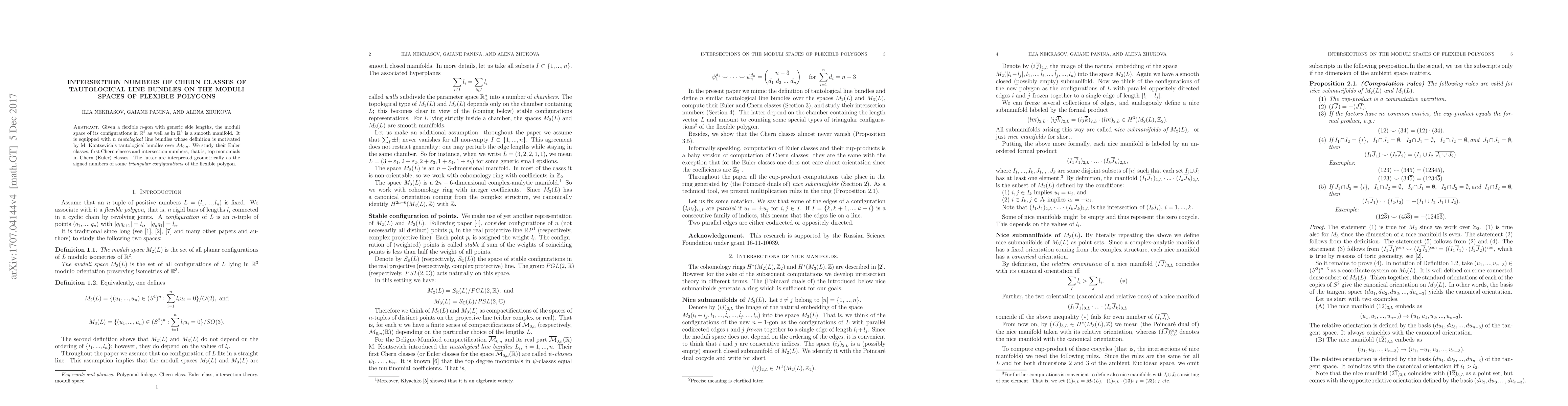 This paper investigates the intersection numbers of Chern classes associated with tautological line bundles on moduli spaces of flexible $n$-gons in $\mathbb{R}^2$ and $\mathbb{R}^3$. These geometric objects are linked to triangular configurations of the polygons, with the top monomials in Chern classes representing signed counts of such configurations.