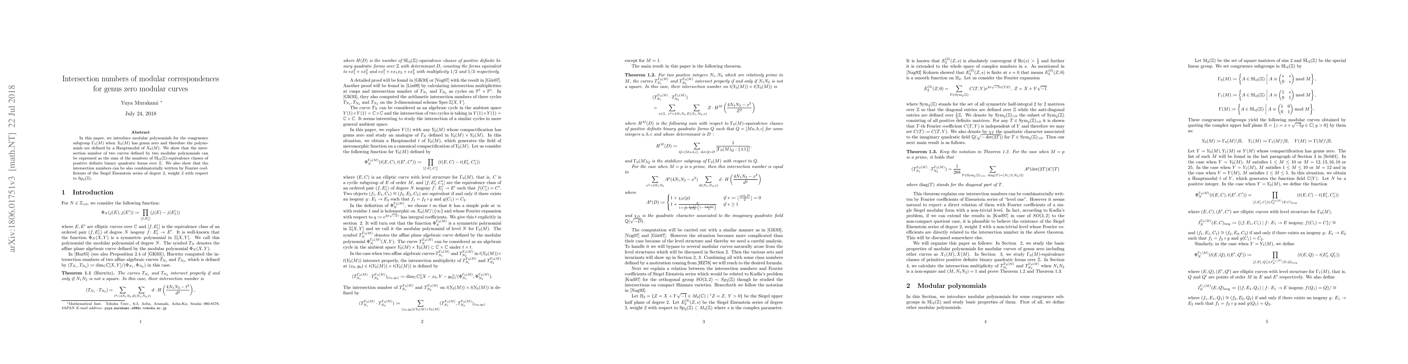 This paper introduces modular polynomials for genus zero modular curves and demonstrates how their intersection numbers relate to $\mathrm{SL}_2(\mathbb{Z})$-equivalence classes of binary quadratic forms and Fourier coefficients of the Siegel Eisenstein series.