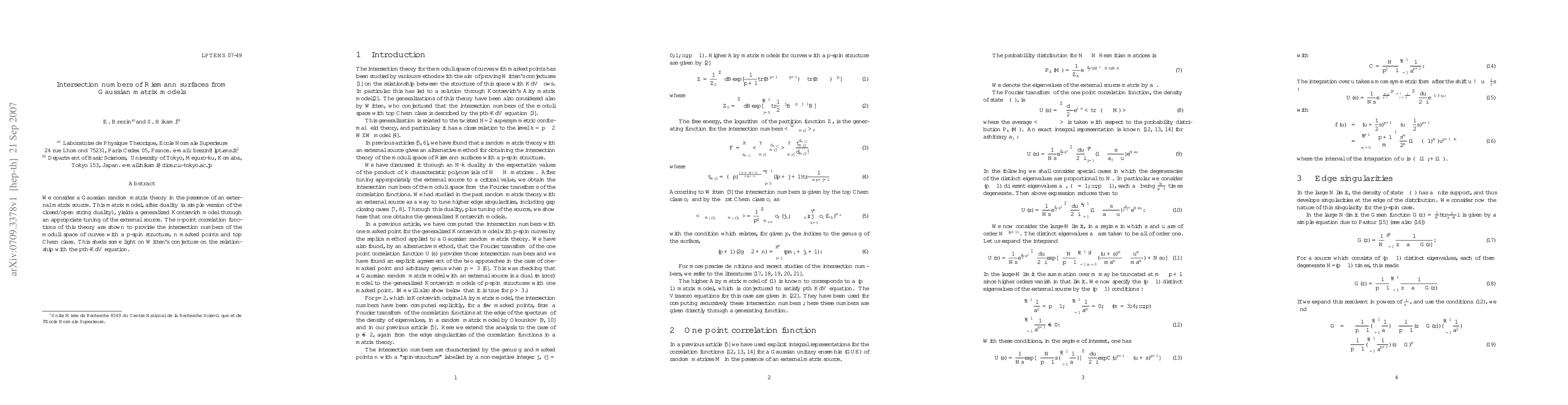 This paper explores Gaussian matrix models with an external matrix source, revealing that their n-point correlation functions correspond to intersection numbers on moduli spaces of Riemann surfaces with p-spin structures. This connection supports Witten's conjecture linking these intersection numbers to the pth-KdV equation.
