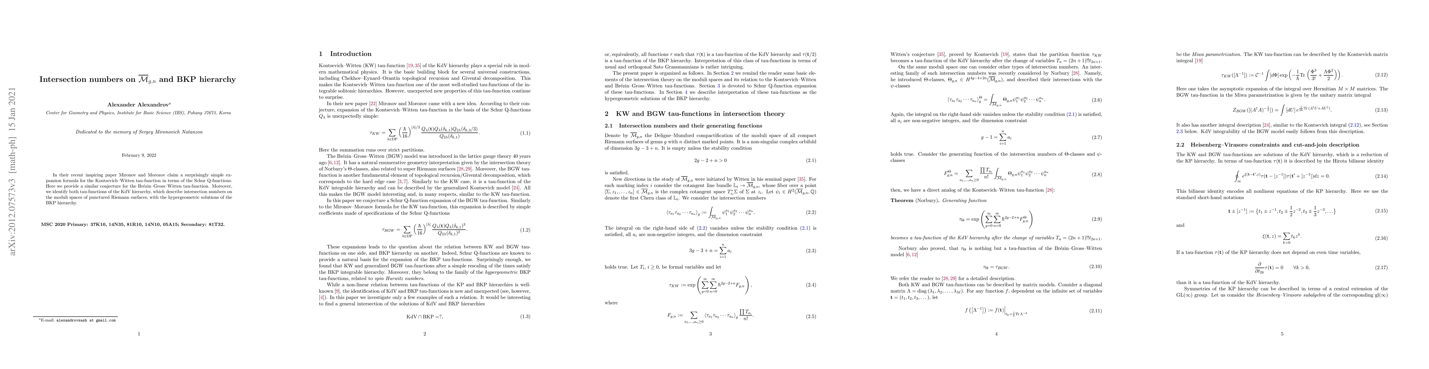 In their recent inspiring paper Mironov and Morozov claim a surprisingly simple expansion formula for the Kontsevich-Witten tau-function in terms of the Schur Q-functions. Here we provide a similar conjecture for the Br\'ezin-Gross-Witten tau-function. Moreover, we identify both tau-functions of the KdV hierarchy, which describe intersection numbers on the moduli spaces of punctured Riemann surfaces, with the hypergeometric solutions of the BKP hierarchy.