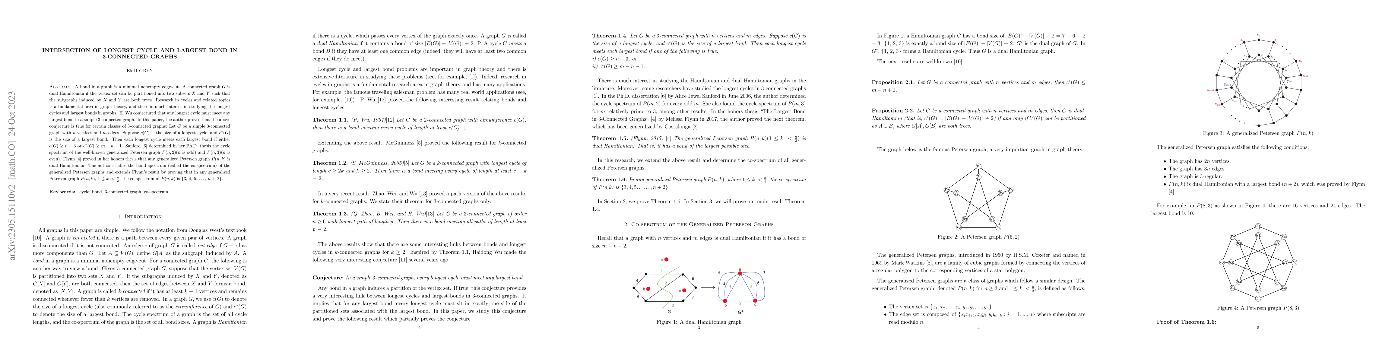 A bond in a graph is a minimal nonempty edge-cut. A connected graph $G$ is dual Hamiltonian if the vertex set can be partitioned into two subsets $X$ and $Y$ such that the subgraphs induced by $X$ and $Y$ are both trees. There is much interest in studying the longest cycles and largest bonds in graphs. H. Wu conjectured that any longest cycle must meet any largest bond in a simple 3-connected graph. In this paper, the author proves that the above conjecture is true for certain classes of 3-connected graphs: Let $G$ be a simple 3-connected graph with $n$ vertices and $m$ edges. Suppose $c(G)$ is the size of a longest cycle, and $c^*(G)$ is the size of a largest bond. Then each longest cycle meets each largest bond if either $c(G) \geq n - 3$ or $c^*(G) \geq m - n - 1$. Sanford determined in her Ph.D. thesis the cycle spectrum of the well-known generalized Petersen graph $P(n, 2)$ ($n$ is odd) and $P(n, 3)$ ($n$ is even). Flynn proved in her honors thesis that any generalized Petersen graph $P(n, k)$ is dual Hamiltonian. The author studies the bond spectrum (called the co-spectrum) of the generalized Petersen graphs and extends Flynn's result by proving that in any generalized Petersen graph $P(n, k)$, $1 \leq k < \frac{n}{2}$, the co-spectrum of $P(n, k)$ is $\{3, 4, 5, ..., n+2\}$.