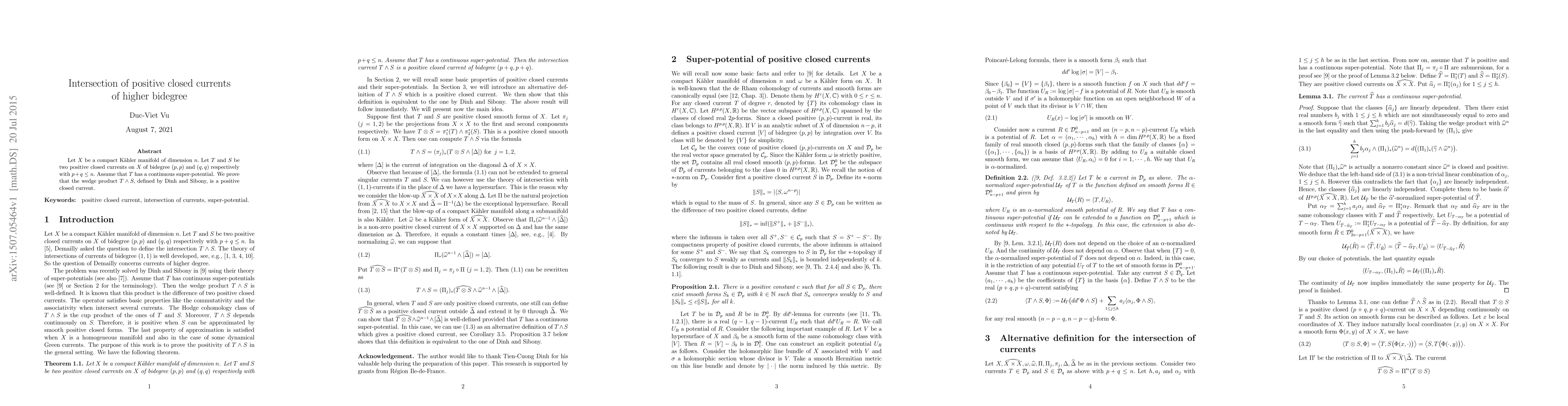 This paper proves that the wedge product of two positive closed currents $T$ and $S$ on a compact Kähler manifold $X$, defined by Dinh and Sibony, is a positive closed current when $T$ has a continuous super-potential. This result extends the intersection theory for positive closed currents of higher bidegree.