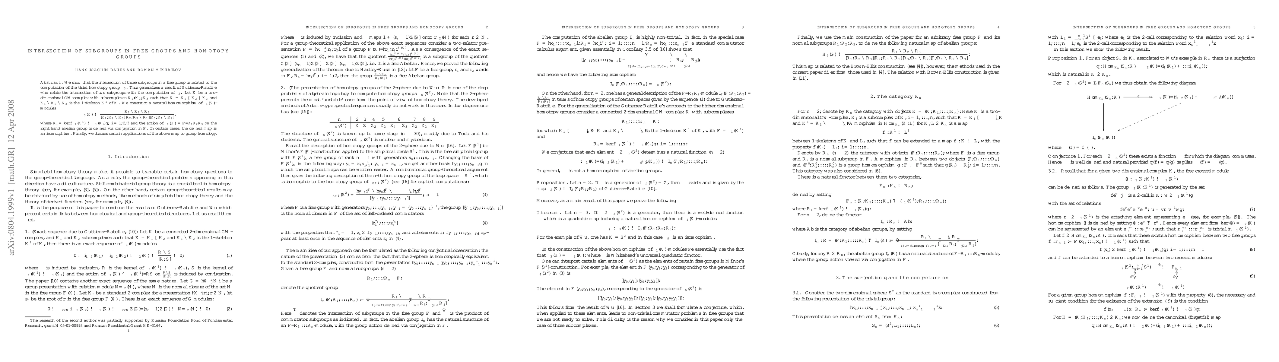 We show that the intersection of three subgroups in a free group is related to the computation of the third homotopy group $\pi_3$. This generalizes a result of Gutierrez-Ratcliffe who relate the intersection of two subgroups with the computation of $\pi_2$. Let $K$ be a two-dimensional CW-complex with subcomplexes $K_1,K_2,K_3$ such that $K=K_1\cup K_2\cup K_3$ and $K_1\cap K_2\cap K_3$ is the 1-skeleton $K^1$ of $K$. We construct a natural homomorphism of $\pi_1(K)$-modules $$ \pi_3(K)\to \frac{R_1\cap R_2\cap R_3}{[R_1,R_2\cap R_3][R_2,R_3\cap R_1][R_3,R_1\cap R_2]}, $$ where $R_i=ker\{\pi_1(K^1)\to \pi_1(K_i)\}, i=1,2,3$ and the action of $\pi_1(K)=F/R_1R_2R_3$ on the right hand abelian group is defined via conjugation in $F$. In certain cases, the defined map is an isomorphism. Finally, we discuss certain applications of the above map to group homology.