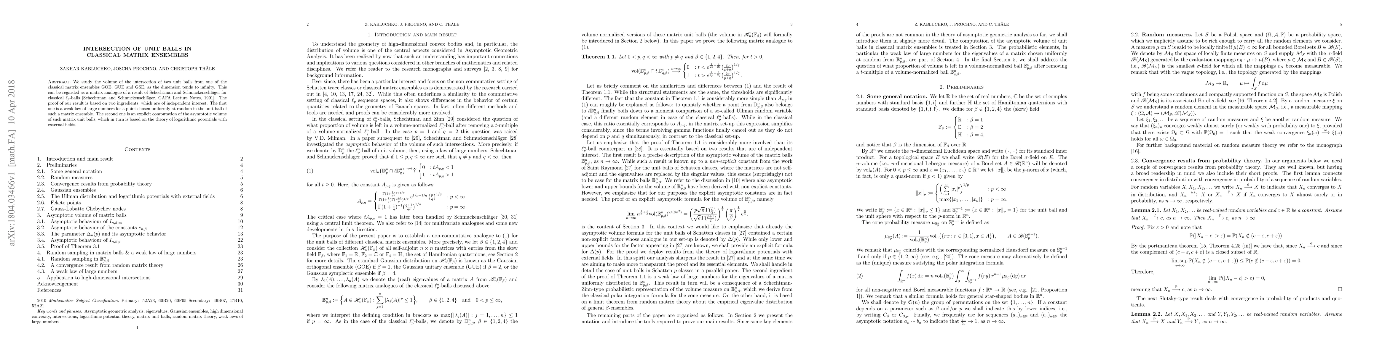 Researchers investigate the intersection of unit balls in classical matrix ensembles as dimension increases, finding that their volume approaches a predictable limit.