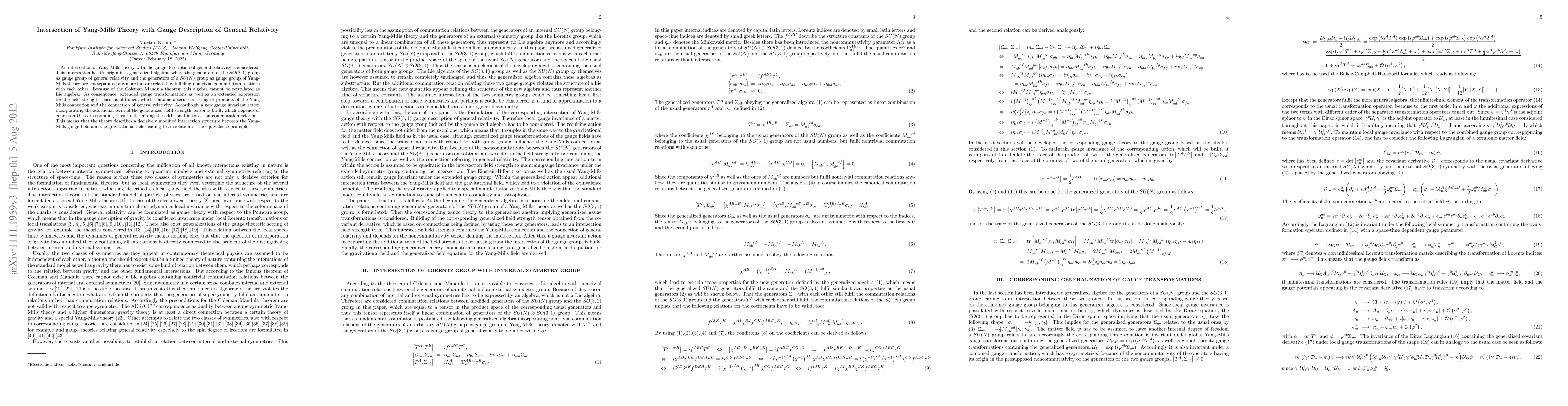 An intersection of Yang-Mills theory with the gauge description of general relativity is considered. This intersection has its origin in a generalized algebra, where the generators of the SO(3,1) group as gauge group of general relativity and the generators of a SU(N) group as gauge group of Yang-Mills theory are not separated anymore but are related by fulfilling nontrivial commutation relations with each other. Because of the Coleman Mandula theorem this algebra cannot be postulated as Lie algebra. As consequence, extended gauge transformations as well as an extended expression for the field strength tensor is obtained, which contains a term consisting of products of the Yang Mills connection and the connection of general relativity. Accordingly a new gauge invariant action incorporating the additional term of the generalized field strength tensor is built, which depends of course on the corresponding tensor determining the additional intersection commutation relations. This means that the theory describes a decisively modified interaction structure between the Yang-Mills gauge field and the gravitational field leading to a violation of the equivalence principle.