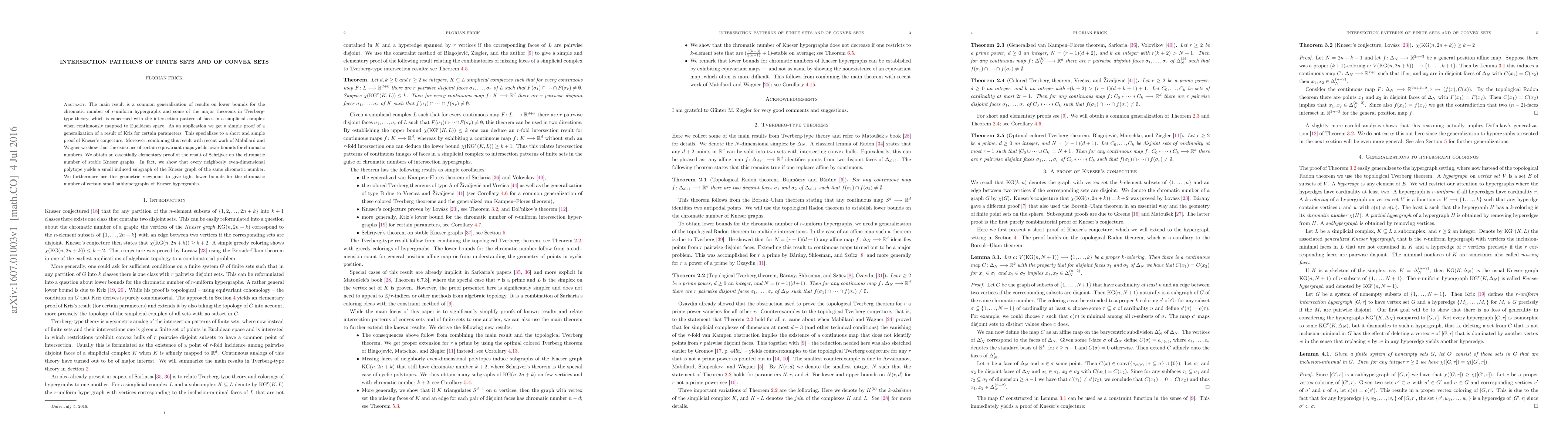 The main result is a common generalization of results on lower bounds for the chromatic number of r-uniform hypergraphs and some of the major theorems in Tverberg-type theory, which is concerned with the intersection pattern of faces in a simplicial complex when continuously mapped to Euclidean space. As an application we get a simple proof of a generalization of a result of Kriz for certain parameters. This specializes to a short and simple proof of Kneser's conjecture. Moreover, combining this result with recent work of Mabillard and Wagner we show that the existence of certain equivariant maps yields lower bounds for chromatic numbers. We obtain an essentially elementary proof of the result of Schrijver on the chromatic number of stable Kneser graphs. In fact, we show that every neighborly even-dimensional polytope yields a small induced subgraph of the Kneser graph of the same chromatic number. We furthermore use this geometric viewpoint to give tight lower bounds for the chromatic number of certain small subhypergraphs of Kneser hypergraphs.