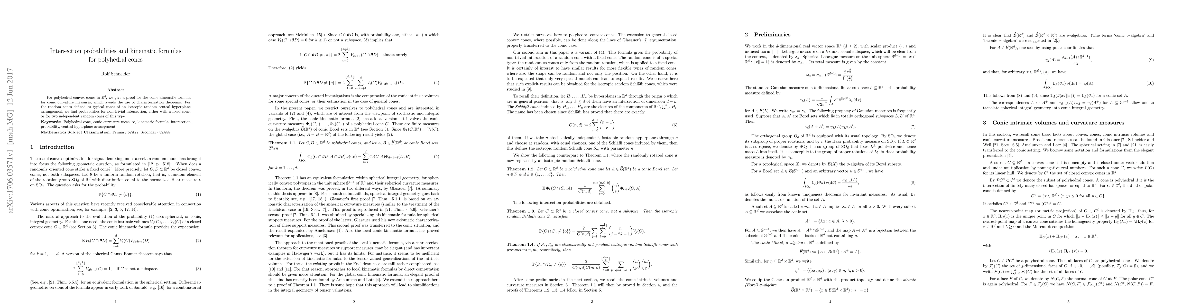This paper proves the conic kinematic formula for curvature measures of polyhedral convex cones without relying on characterization theorems, and calculates the probabilities of non-trivial intersections for random cones defined by isotropic random hyperplane arrangements, either with a fixed cone or between two independent random cones.