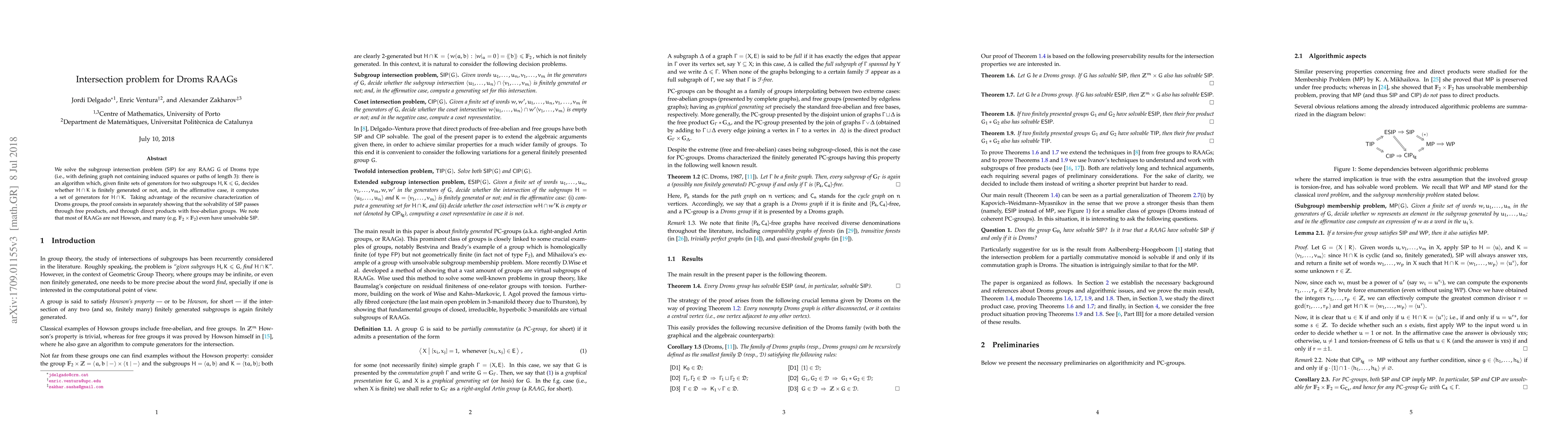This paper presents an algorithm to determine if the intersection of two subgroups in a Droms RAAG is finitely generated, and computes generators if it is. The solution leverages the recursive structure of Droms groups and proves the problem's solvability through free and direct product decompositions.