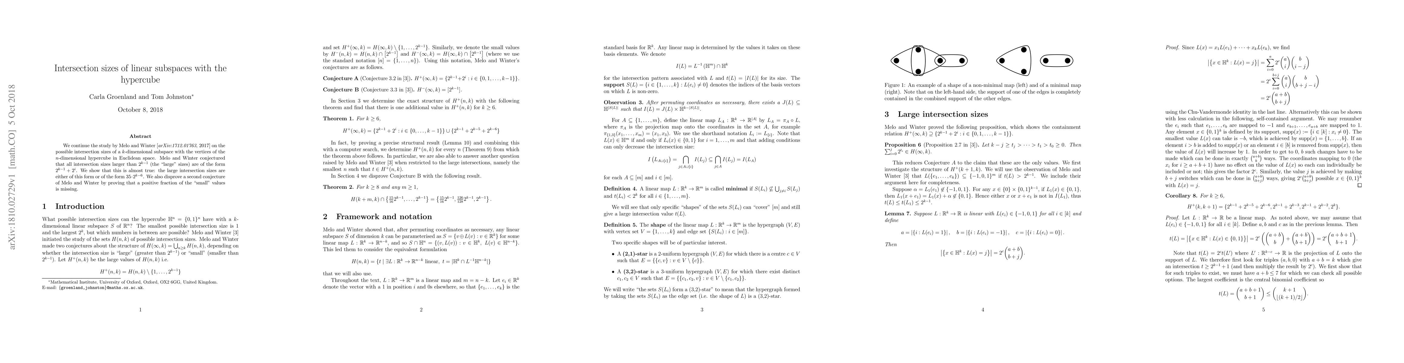 We continue the study by Melo and Winter [arXiv:1712.01763, 2017] on the possible intersection sizes of a $k$-dimensional subspace with the vertices of the $n$-dimensional hypercube in Euclidean space. Melo and Winter conjectured that all intersection sizes larger than $2^{k-1}$ (the "large" sizes) are of the form $2^{k-1}+2^i$. We show that this is almost true: the large intersection sizes are either of this form or of the form $35\cdot 2^{k-6}$. We also disprove a second conjecture of Melo and Winter by proving that a positive fraction of the "small" values is missing.