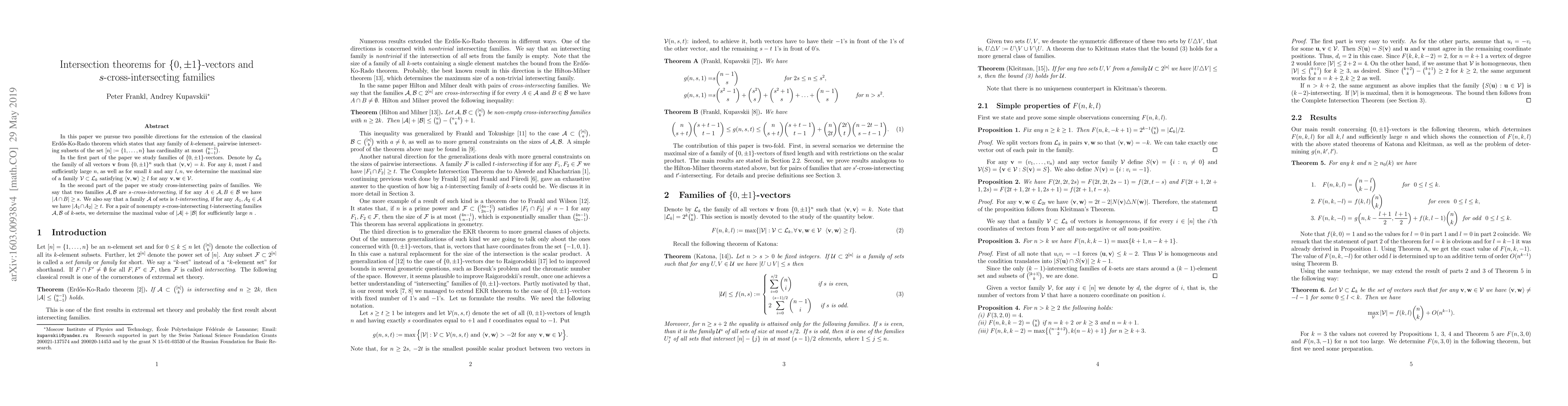 This paper extends the classical Erdős-Ko-Rado theorem by investigating two directions: maximal size families of $\{0,\pm 1\}$-vectors with specific inner product intersections and maximal sizes of $s$-cross-intersecting families of $k$-sets with $t$-intersecting properties.