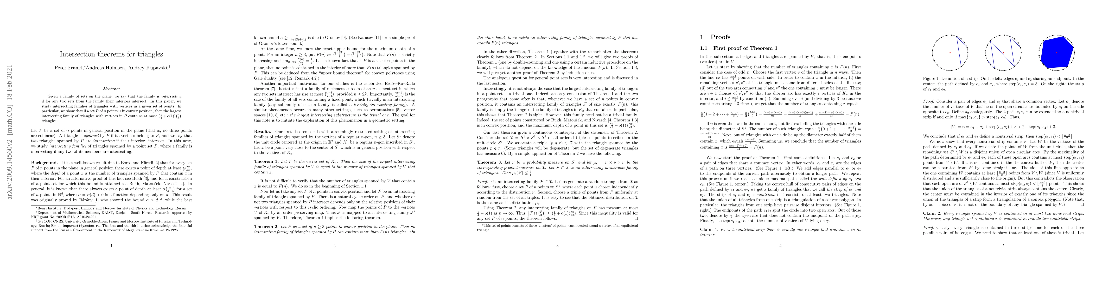 Given a family of sets on the plane, we say that the family is intersecting if for any two sets from the family their interiors intersect. In this paper, we study intersecting families of triangles with vertices in a given set of points. In particular, we show that if a set $P$ of $n$ points is in convex position, then the largest intersecting family of triangles with vertices in $P$ contains at most $(\frac{1}{4}+o(1))\binom{n}{3}$ triangles.