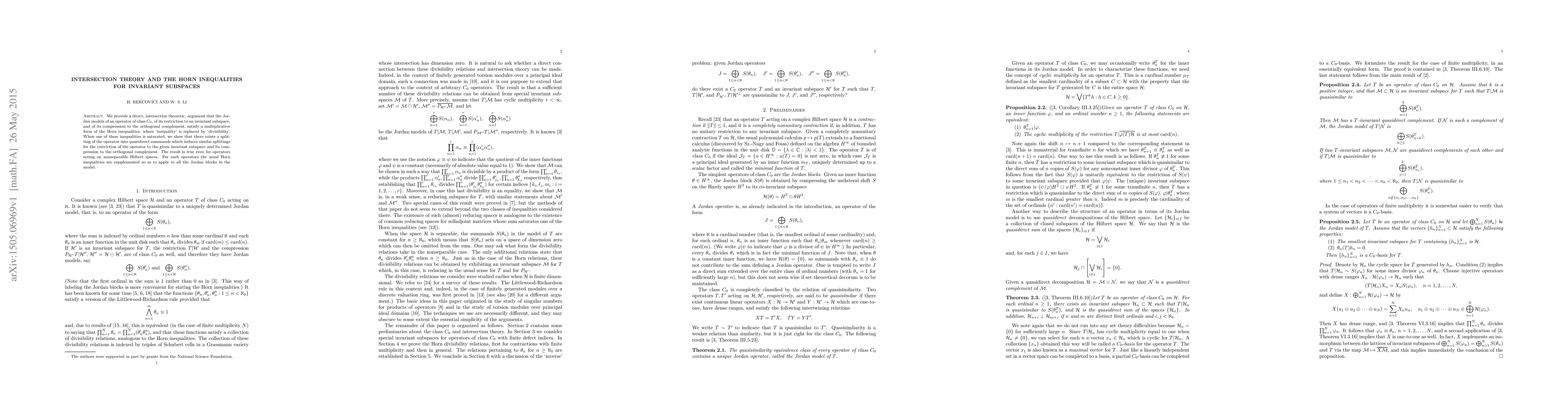 We provide a direct, intersection theoretic, argument that the Jordan models of an operator of class C_{0}, of its restriction to an invariant subspace, and of its compression to the orthogonal complement, satisfy a multiplicative form of the Horn inequalities, where `inequality' is replaced by `divisibility'. When one of these inequalities is saturated, we show that there exists a splitting of the operator into quasidirect summands which induces similar splittings for the restriction of the operator to the given invariant subspace and its compression to the orthogonal complement. The result is true even for operators acting on nonseparable Hilbert spaces. For such operators the usual Horn inequalities are supplemented so as to apply to all the Jordan blocks in the model.