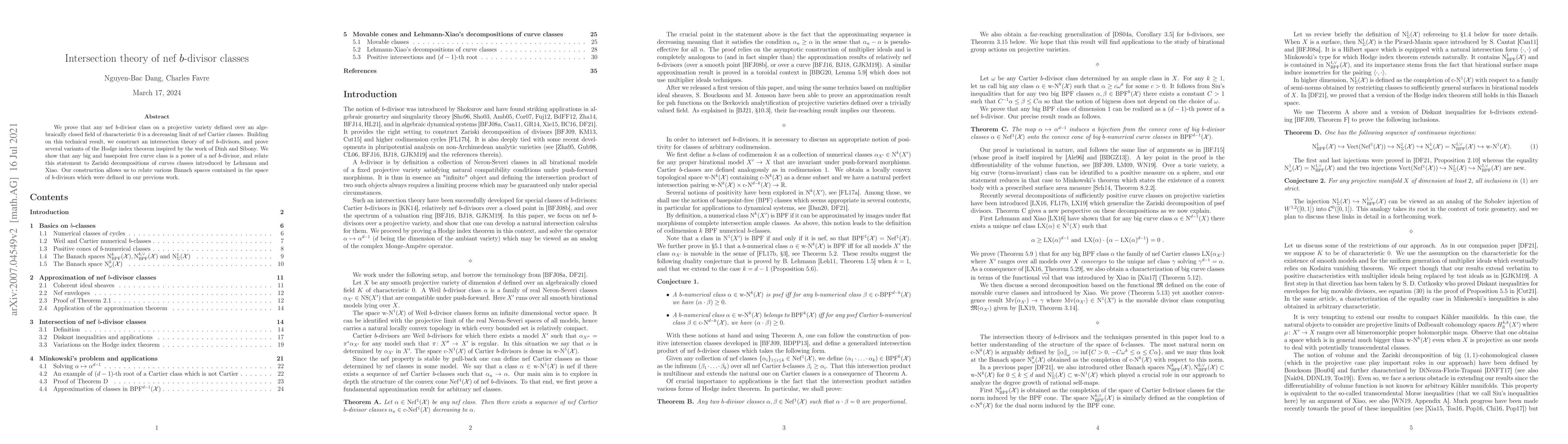 We prove that any nef b-divisor class on a projective variety defined over an algebraically closed field of characteristic 0 is a decreasing limit of nef Cartier classes. Building on this technical result, we construct an intersection theory of nef b-divisors, and prove several variants of the Hodge index theorem inspired by the work of Dinh and Sibony. We show that any big and basepoint free curve class is a power of a nef b-divisor, and relate this statement to Zariski decompositions of curves classes introduced by Lehmann and Xiao. Our construction allows us to relate various Banach spaces contained in the space of b-divisors which were defined in our previous work.5