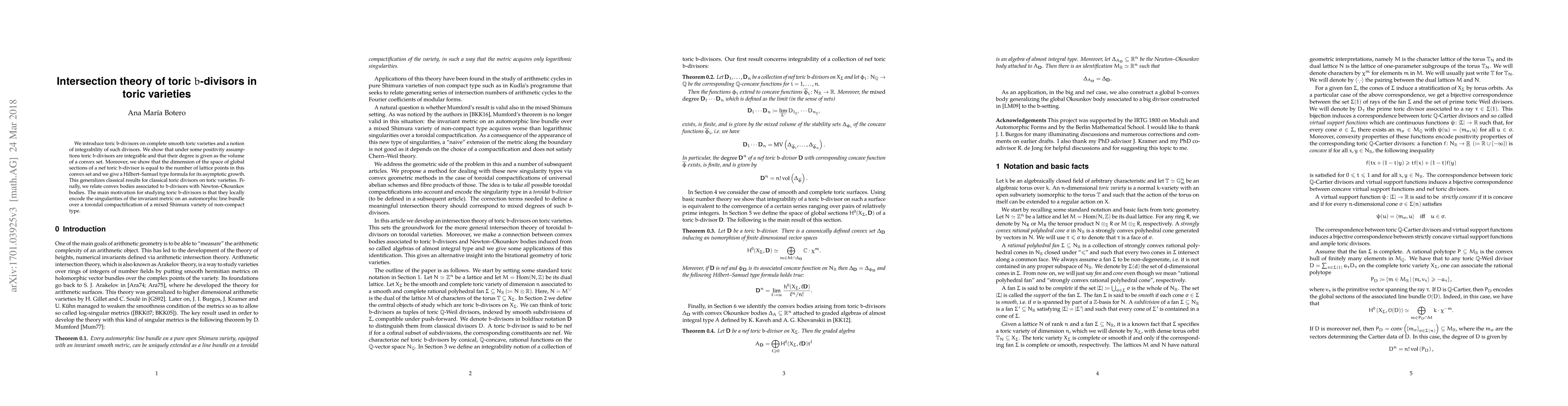 We introduce toric $b$-divisors on complete smooth toric varieties and a notion of integrability of such divisors. We show that under some positivity assumptions toric $b$-divisors are integrable and that their degree is given as the volume of a convex set. Moreover, we show that the dimension of the space of global sections of a nef toric $b$-divisor is equal to the number of lattice points in this convex set and we give a Hilbert--Samuel type formula for its asymptotic growth. This generalizes classical results for classical toric divisors on toric varieties. Finally, we relate convex bodies associated to $b$-divisors with Newton--Okounkov bodies. The main motivation for studying toric $b$-divisors is that they locally encode the singularities of the invariant metric on an automorphic line bundle over a toroidal compactification of a mixed Shimura variety of non-compact type.