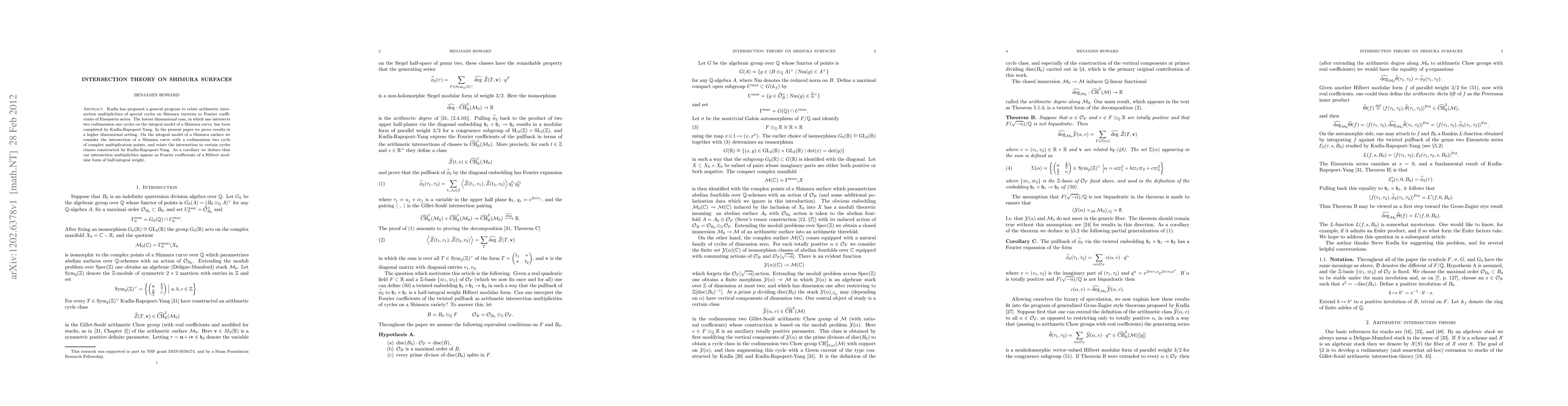 The paper extends Kudla's program by proving intersection theory results on Shimura surfaces, linking intersections of cycles to Fourier coefficients of Eisenstein series, and showing that these intersection multiplicities correspond to cycles classes and Fourier coefficients of Hilbert modular forms of half-integral weight.