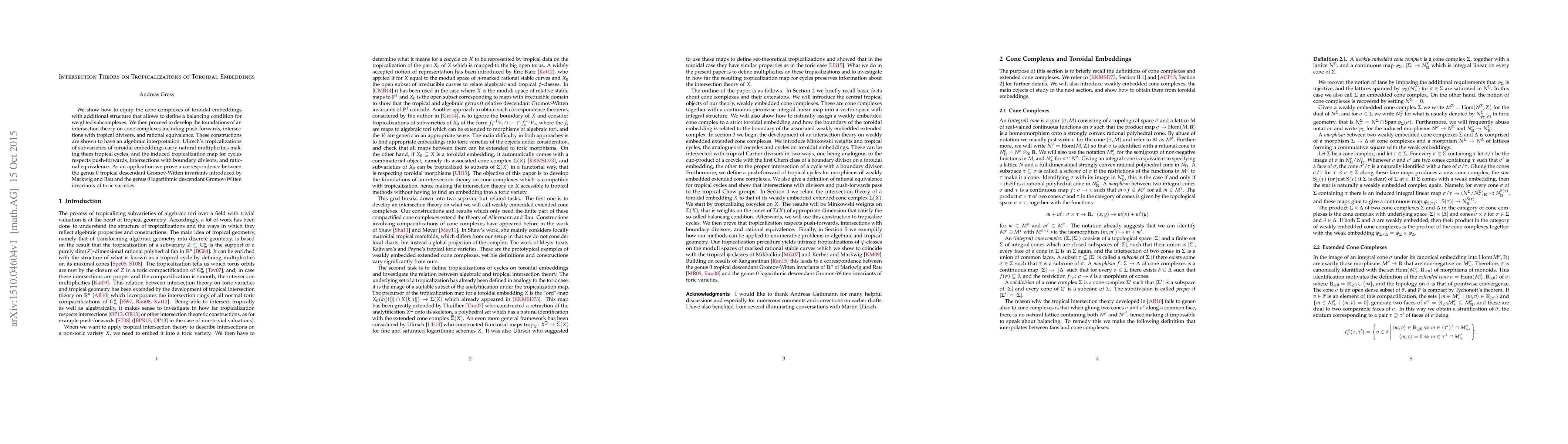 Researchers develop an intersection theory for tropicalizations of toroidal embeddings, enabling comparisons between Gromov-Witten invariants in genus 0 logarithmic descendant theory and Markwig-Rau's genus 0 tropical descendant theory.