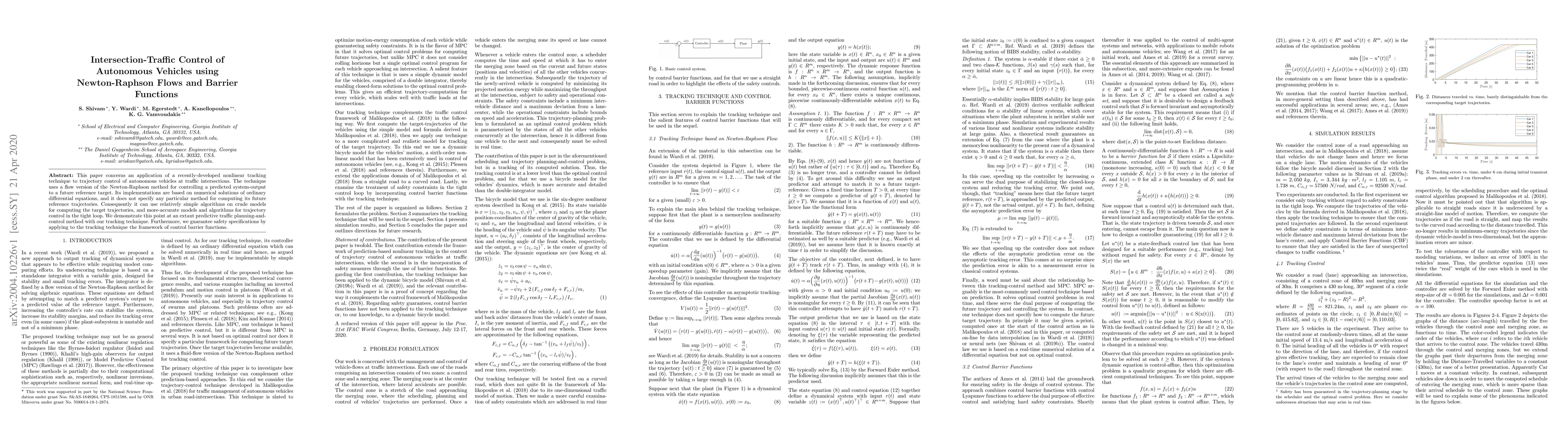 This paper concerns an application of a recently-developed nonlinear tracking technique to trajectory control of autonomous vehicles at traffic intersections. The technique uses a flow version of the Newton-Raphson method for controlling a predicted system-output to a future reference target. Its implementations are based on numerical solutions of ordinary differential equations, and it does not specify any particular method for computing its future reference trajectories. Consequently it can use relatively simple algorithms on crude models for computing the target trajectories, and more-accurate models and algorithms for trajectory control in the tight loop. We demonstrate this point at an extant predictive traffic planning-and-control method with our tracking technique. Furthermore, we guarantee safety specifications by applying to the tracking technique the framework of control barrier functions.