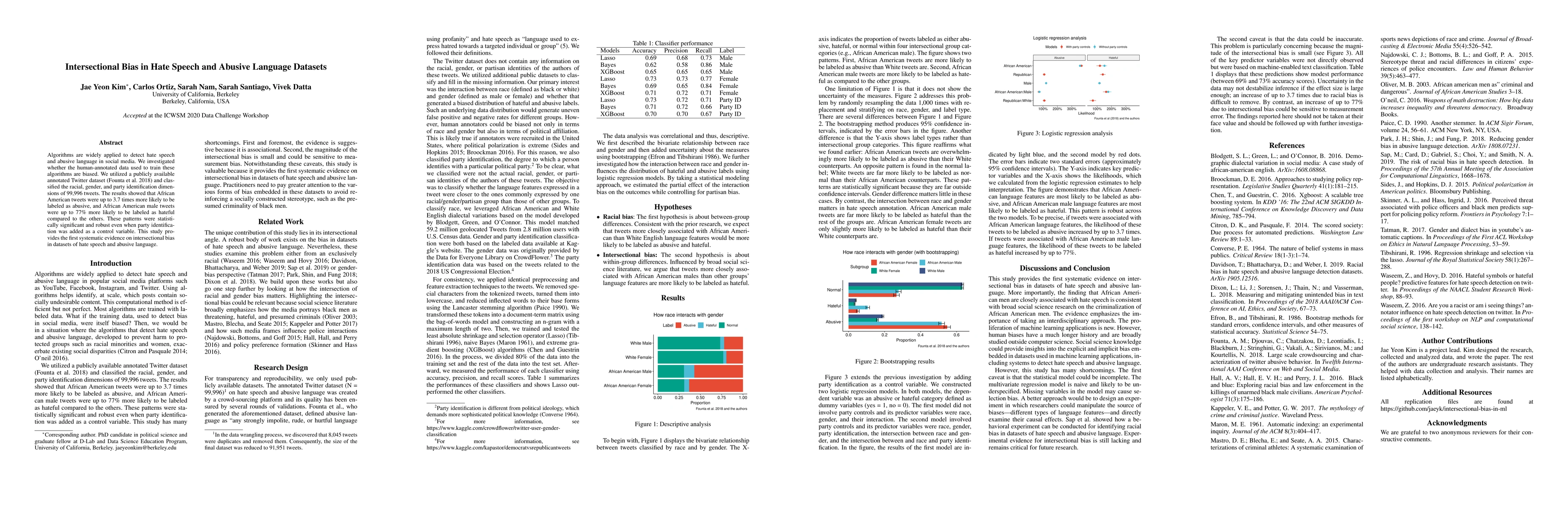 This study investigates bias in a Twitter dataset used to train hate speech detection algorithms, revealing significant intersectional bias where African American tweets, especially those from African American males, are disproportionately labeled as abusive and hateful. These findings highlight systemic inequities in training data.