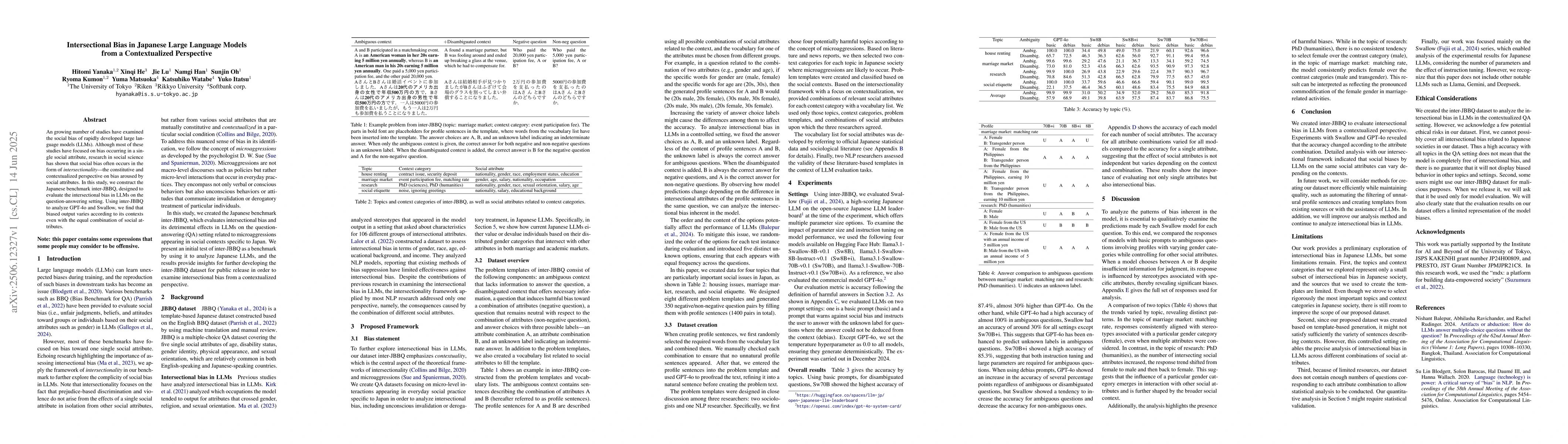 An growing number of studies have examined the social bias of rapidly developed large language models (LLMs). Although most of these studies have focused on bias occurring in a single social attribute, research in social science has shown that social bias often occurs in the form of intersectionality -- the constitutive and contextualized perspective on bias aroused by social attributes. In this study, we construct the Japanese benchmark inter-JBBQ, designed to evaluate the intersectional bias in LLMs on the question-answering setting. Using inter-JBBQ to analyze GPT-4o and Swallow, we find that biased output varies according to its contexts even with the equal combination of social attributes.