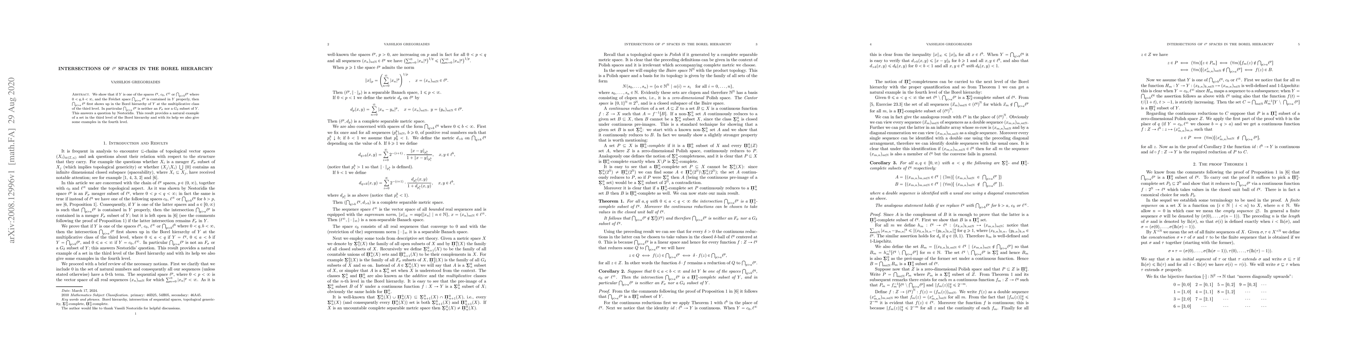 We show that if $Y$ is one of the spaces $\ell^q$, $c_0$, $\ell^\infty$ or ${\textstyle \bigcap_{p > b}} \ell^p$ where $0 < q,b < \infty$, and the Fr\'{e}chet space $\textstyle \bigcap_{p > a} \ell^p$ is contained in $Y$ properly, then $\textstyle \bigcap_{p > a} \ell^p$ first shows up in the Borel hierarchy of $Y$ at the multiplicative class of the third level. In particular $\textstyle \bigcap_{p > a} \ell^p$ is neither an $F_\sigma$ nor a $G_\delta$ subset of $Y$. This answers a question by Nestoridis. This result provides a natural example of a set in the third level of the Borel hierarchy and with its help we also give some examples in the fourth level.