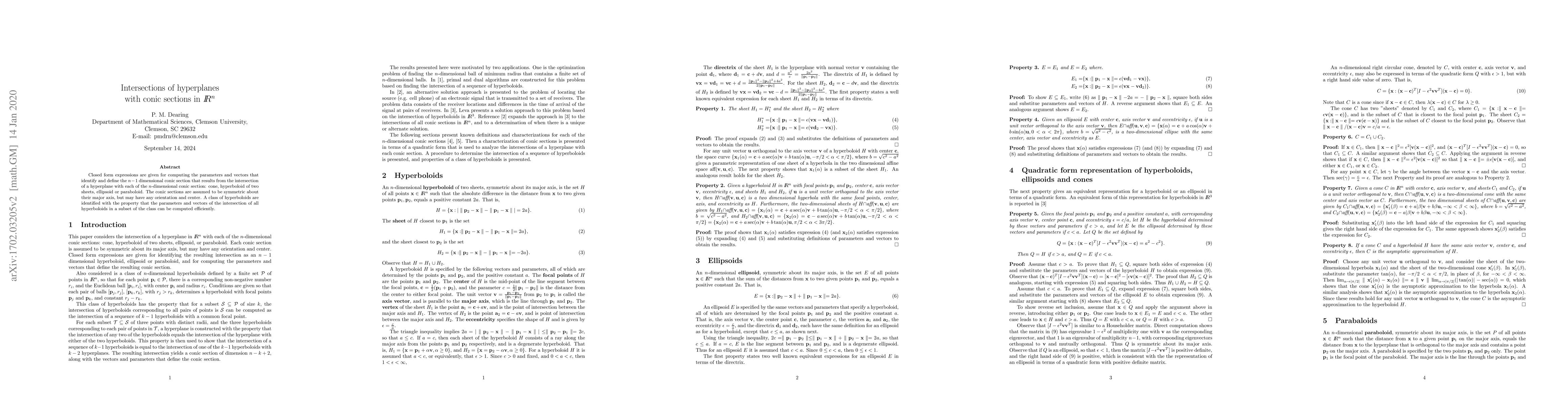 Closed form expressions are given for computing the parameters and vectors that identify and define the $n-1$ dimensional conic section that results from the intersection of a hyperplane with an $n$-dimensional conic section: cone, hyperboloid of two sheets, ellipsoid or paraboloid. The conic sections are assumed to be symmetric about their major axis, but may have any orientation and center. A class of hyperboloids are identified with the property that the parameters and vectors of the intersection of all hyperboloids in a subset of the class can be computed efficiently.