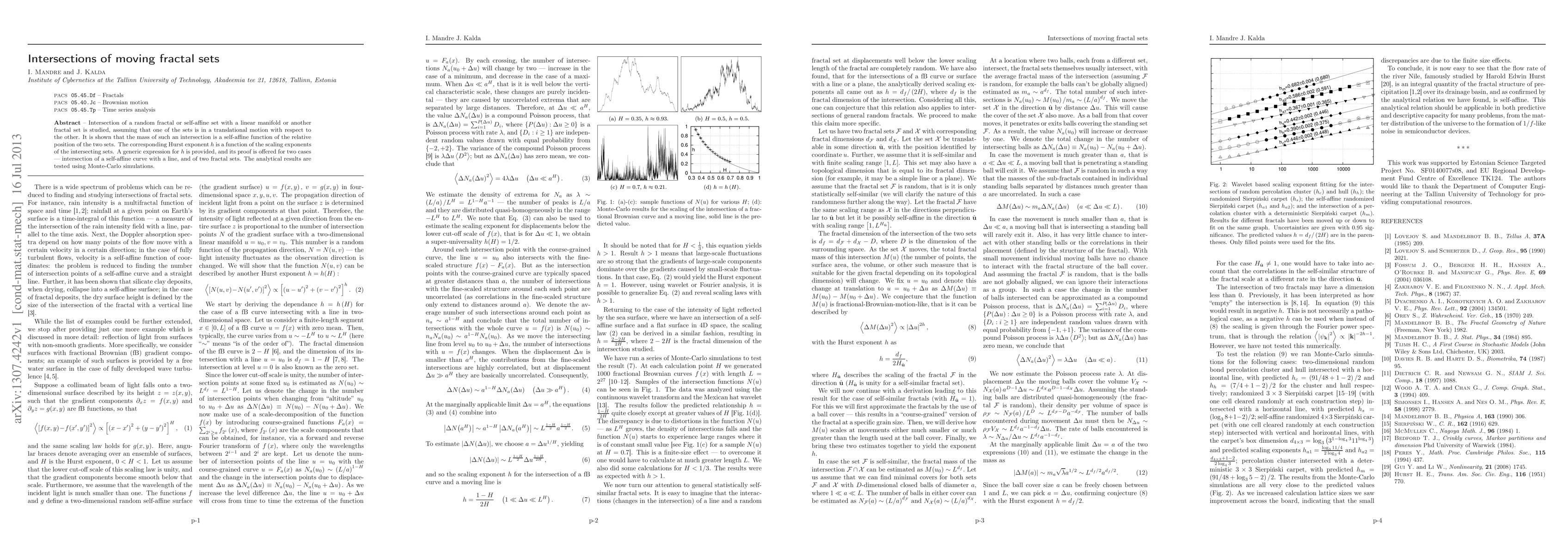 Intersection of a random fractal or self-affine set with a linear manifold or another fractal set is studied, assuming that one of the sets is in a translational motion with respect to the other. It is shown that the mass of such an intersection is a self-affine function of the relative position of the two sets. The corresponding Hurst exponent h is a function of the scaling exponents of the intersecting sets. A generic expression for h is provided, and its proof is offered for two cases --- intersection of a self-affine curve with a line, and of two fractal sets. The analytical results are tested using Monte-Carlo simulations.