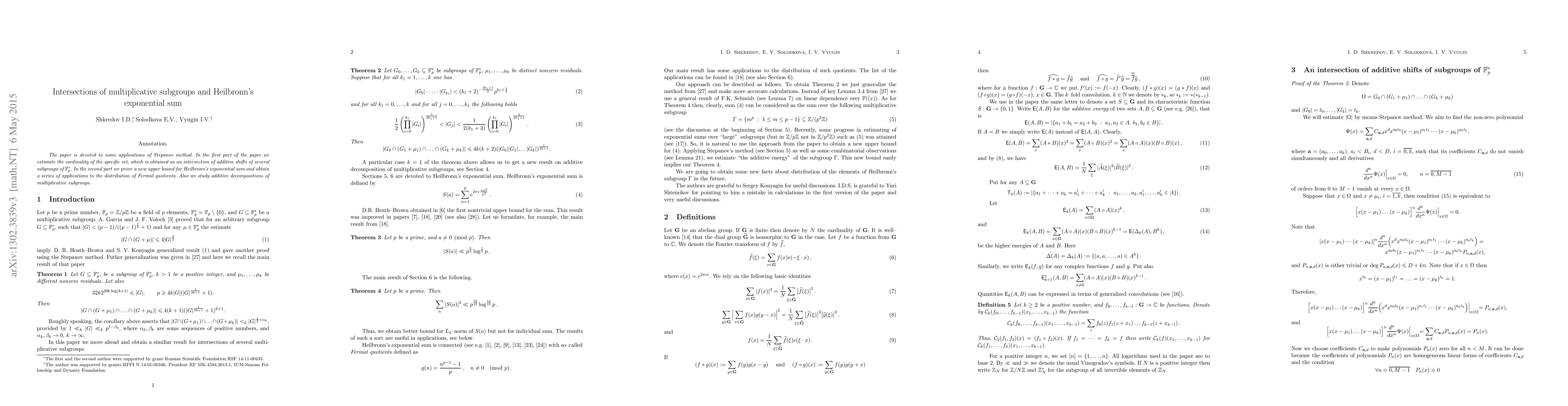 The paper is devoted to some applications of Stepanov method. In the first part of the paper we obtain the estimate of the cardinality of the set, which is obtained as an intersection of additive shifts of some different subgroups of F^*_p. In the second part we prove a new upper bound for Heilbronn's exponential sum and obtain a series of applications of our result to distribution of Fermat quotients. Also we study additive decompositions of multiplicative subgroups.