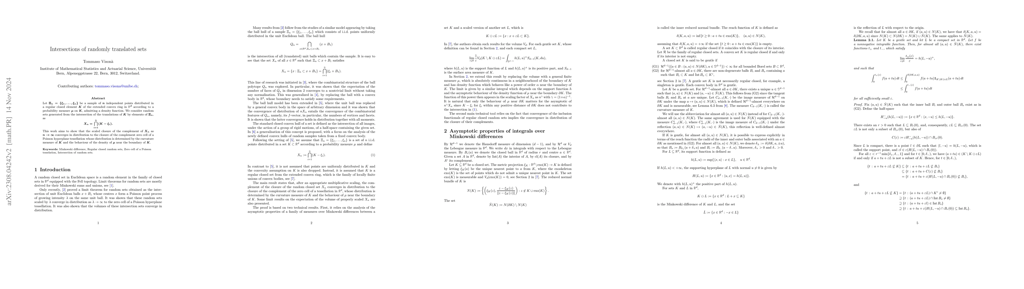 This paper investigates the convergence in distribution of scaled intersections of randomly translated sets, showing that as the sample size $n$ grows, the resulting set converges to the zero cell of a Poisson hyperplane tessellation, with its distribution governed by the curvature of the original set and the density behavior near its boundary.