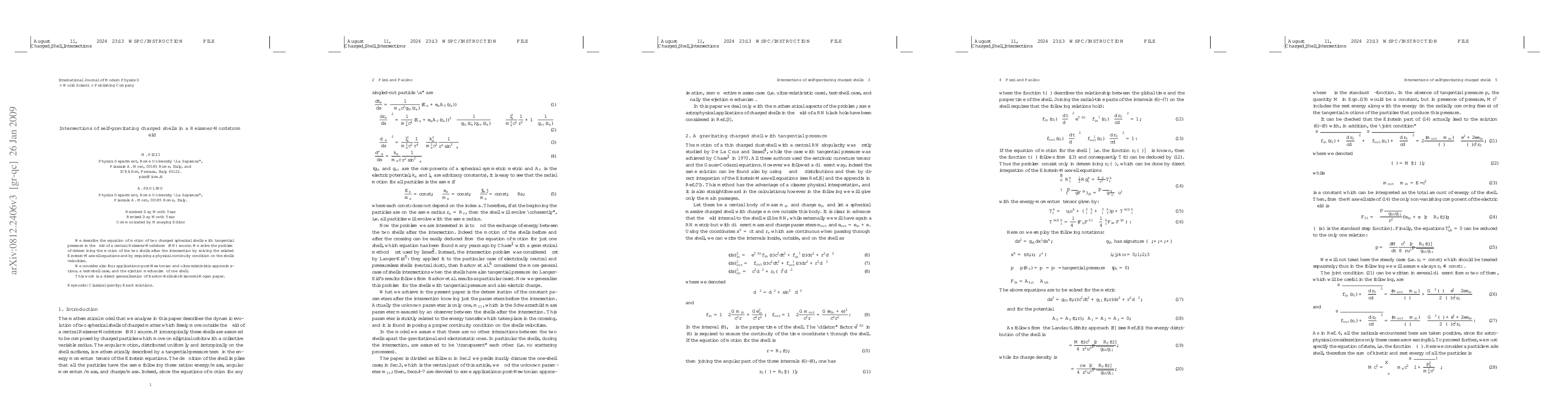 We describe the equation of motion of two charged spherical shells with tangential pressure in the field of a central Reissner-Nordstrom (RN) source. We solve the problem of determining the motion of the two shells \textsl{after} the intersection by solving the related Einstein-Maxwell equations and by requiring a physical continuity condition on the shells velocities. We consider also four applications: post-Newtonian and ultra-relativistic approximations, a test-shell case, and the ejection mechanism of one shell. This work is a direct generalization of Barkov-Belinski-Bisnovati-Kogan paper.