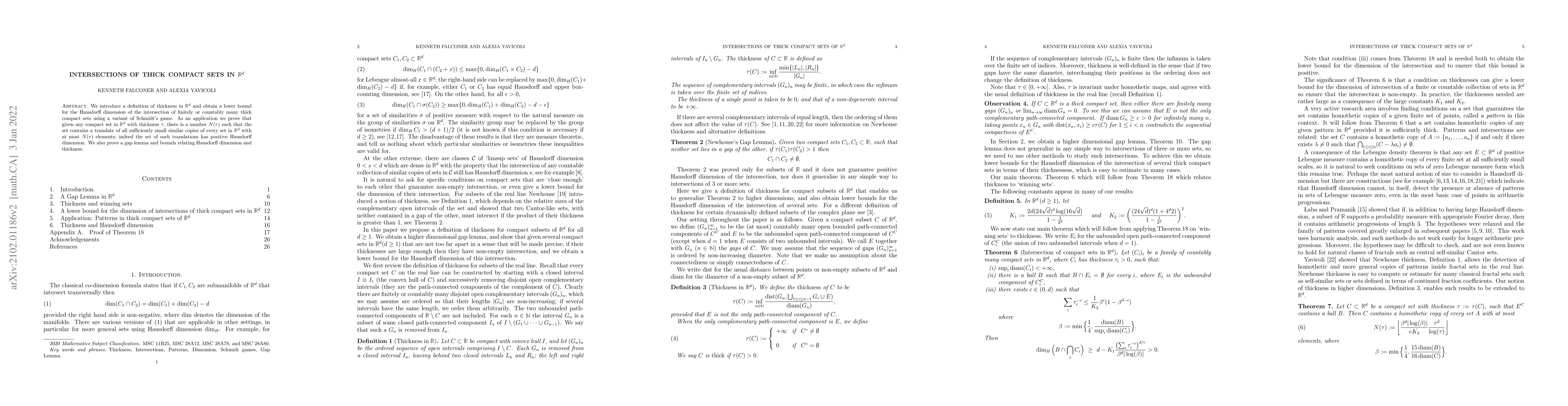 Researchers introduce a new definition of thickness in $ extbf{ extit{R}^d}$ and prove that the intersection of finitely or countably many thick compact sets has a lower bound for its Hausdorff dimension. They also show that any compact set with thickness can contain a translate of sufficiently small similar copies of every set.