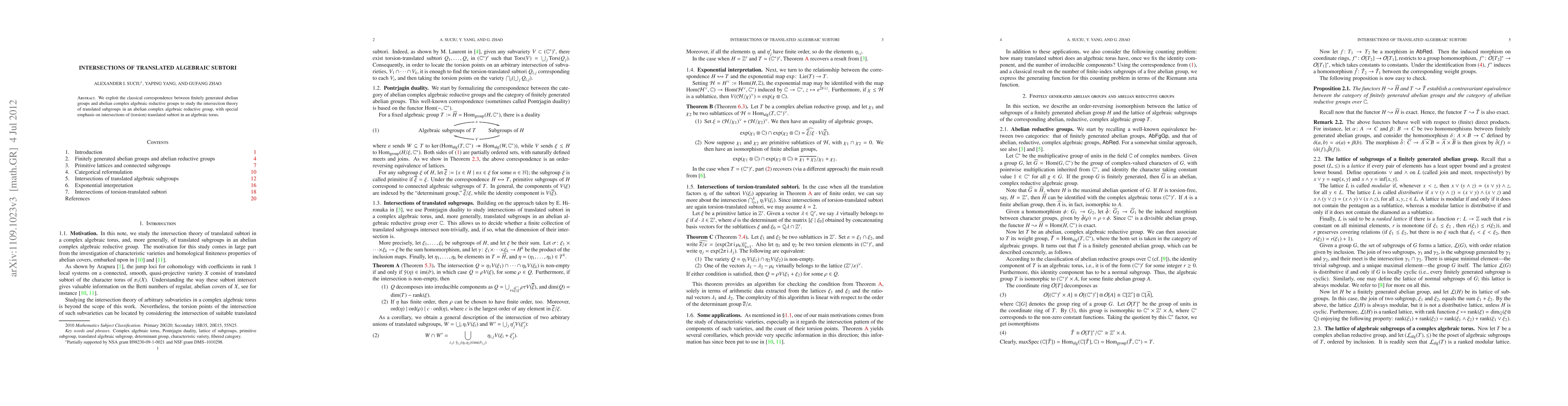 This paper investigates the intersection theory of translated subgroups within abelian complex algebraic reductive groups, focusing on the intersections of translated subtori in algebraic tori using the correspondence between finitely generated abelian groups and these groups.