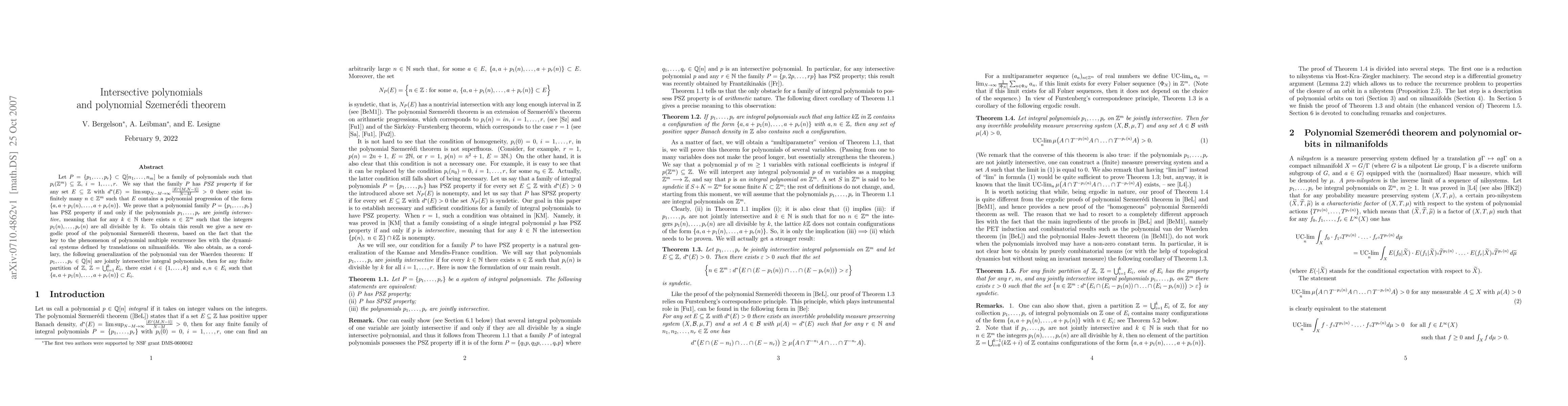 This paper proves that a family of polynomials in $\Q[n_{1},\ld,n_{m}]$ has the Polynomial Szemerédi (PSZ) property if and only if the polynomials are jointly intersective. It also provides a new ergodic proof of the polynomial Szemerédi theorem and generalizes the polynomial van der Waerden theorem based on dynamical systems on nilmanifolds.