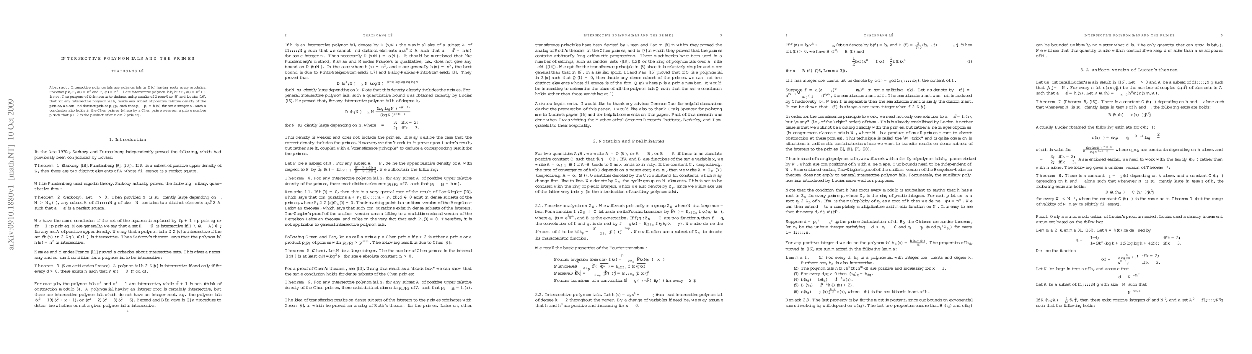This paper explores the properties of intersective polynomials, which have roots modulo every integer, and demonstrates that within any subset of primes with positive relative density, including Chen primes, there exist distinct primes differing by the value of any such polynomial for some integer. This result is derived using findings from Green-Tao and Lucier.